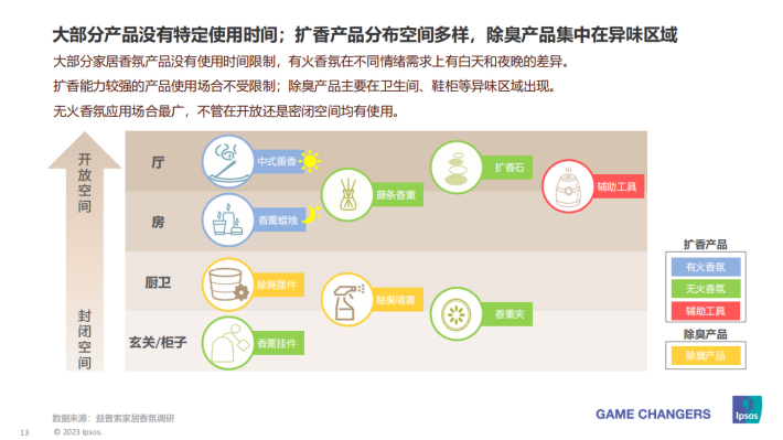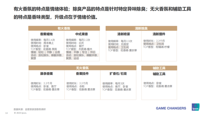 在本报告中,家居香薰香氛指的是在室内环境中使用的,用于清新除臭、提供香味的产品/辅助扩香工具,涉及的产品大致可分为:无火香氛、有火香氛、清新除臭、辅助工具等四个大类。