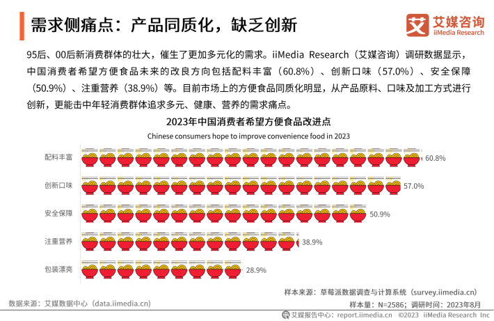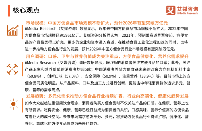 近年来中国方便食品市场规模不断扩大,2022年中国方便食品市场规模已达5961亿元。艾媒咨询分析师认为,2021年,预制菜赛道异军突起,方便食品的产品品类得以扩充,更多的企业和资本进入赛道,在推动食品工业化进程加速的同时,也将进一步推动方便食品行业的发展,预计2026年中国方便食品行业市场规模有望突破万亿元。用户调研:口感、卫生与营养价值成为关注重点,方便食品健康化、营养化需求提升。66.7%的消费者关注方便食品的口感;此外,关注产品卫生和营养价值的消费者均超5成;中国消费者希望方便食品未来的改良方向包括配料丰富(60.8%)、创新口味(57.0%)、安全保障(50.9%)、注重营养(38.9%)等。目前市场上的方便食品同质化明显,从产品原料、口味及加工方式进行创新,更能击中年轻消费群体追求多元、健康、营养的需求痛点。