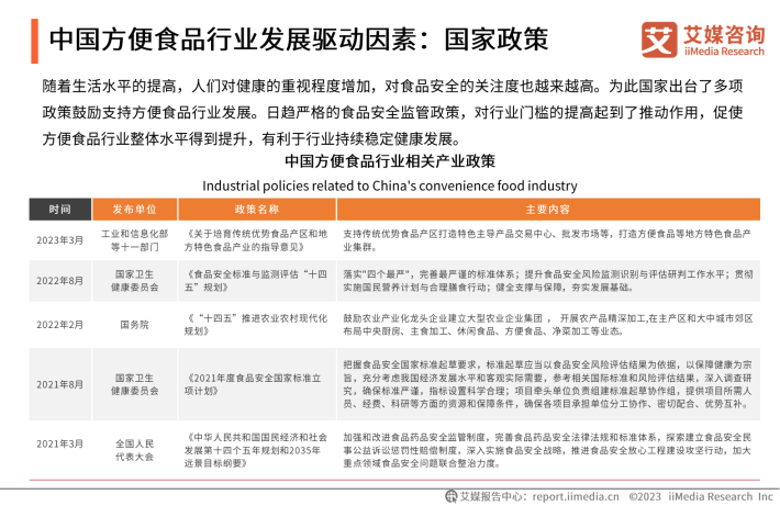 发展趋势:多元化需求推动方便食品行业持续扩容,行业向高端化、健康化趋势发展如今大众越趋注重健康饮食理念,消费者购买方便食品时不仅关注产品的口感,在健康、营养上也有所要求。吃得安全、健康、营养已经日益成为消费者的共识,口感美味、营养价值高的方便食品有着巨大的成长空间。未来市场需求愈发细分、多元,将推动方便食品行业持续扩容,健康化、营养化、高端化的方便食品将成为未来的趋势。