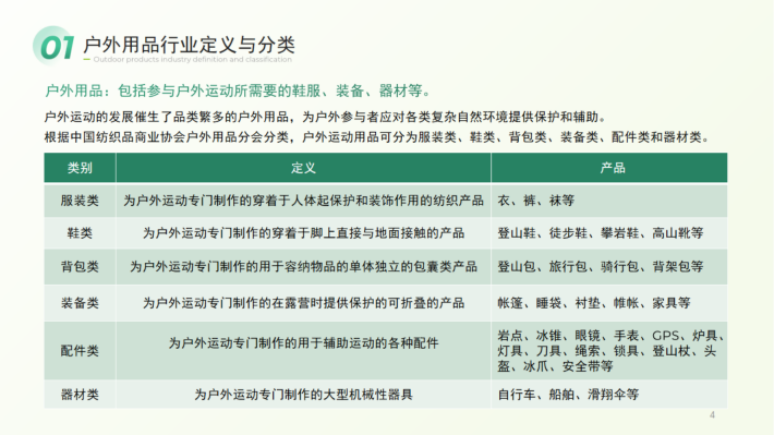 户外运动的发展催生了品类繁多的户外用品,为户外参与者应对各类复杂自然环境提供保护和辅助。根据中国纺织品商业协会户外用品分会分类,户外运动用品可分为服装类、鞋类、背包类、装备类、配件类和器材类。