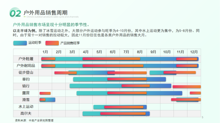 以北半球为例,除了冰雪运动之外,大部分户外运动参与旺季为4-10月份,其中水上运动更为集中,为5-8月份。同时,由于双十一对销售的拉动较大,因此11月份往往也是各类户外用品的销售大月。