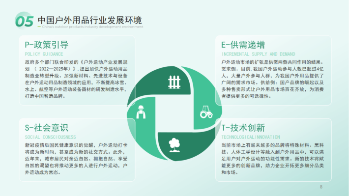 当前市场上有越来越多的品牌将特殊材料、黑科技、人体工学设计等融入到户外用品中,可以满足用户对户外运动的功能性需求。新的技术将赋能更多的创新品牌,助力企业开拓更多细分品类和市场。