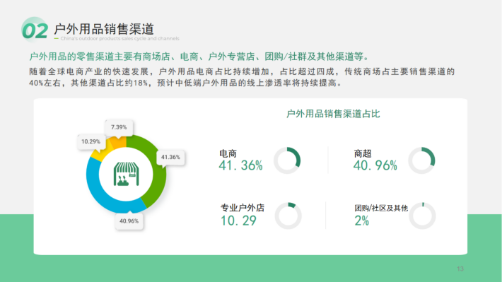 户外运动市场的扩张是供需两侧共同作用的结果。需求侧:目前,我国户外运动参与人数已超过4亿人,大量户外参与人群,为我国户外用品提供了广阔的需求市场。供给侧:国产品牌的崛起以及多种售卖形式让户外用品市场百花齐放,为消费者提供更多的可选择性。