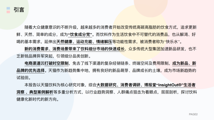 本报告以天猫饮料为核心研究对象,综合大数据研究、消费者调研、博报堂"Insightouto生活者洞察、典型案例解析等多重分析方式,以行业趋势洞察、人群痛点狙击为着眼点,层层剖析,探讨饮料健康化新时代的新方向。