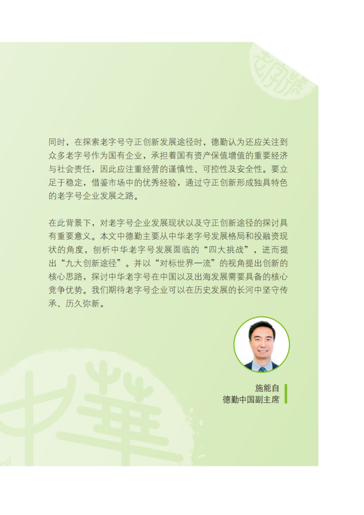 在此背景下,对老字号企业发展现状以及守正创新途径的探讨具有重要意义。本文中德勤主要从中华老字号发展格局和投融资现状的角度,刨析中华老字号发展面临的“四大挑战”,进而提出“九大创新途径”。并以“对标世界一流”的视角提出创新的核心思路,探讨中华老字号在中国以及出海发展需要具备的核心竞争优势。我们期待老字号企业可以在历史发展的长河中坚守传承、历久弥新。