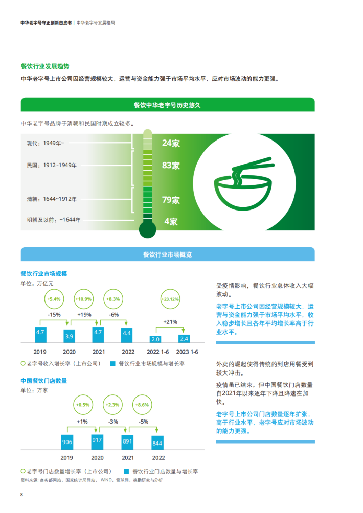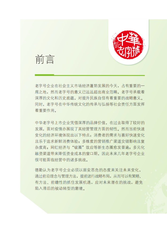 中华老字号上市企业凭借深厚的品牌价值,在过去取得了较好的发展,面对疫情亦展现了其经营管理方面的韧性。然而当前快速变化的经济环境体现出以下特点:消费者的需求与喜好快速变化且乐于追求新鲜消费体验;多维度的营销推广渠道交错影响且复杂度高;网红经济与“破圈”效应等新生态圈愈发普遍;多元化融资渠道带来降低资金成本的窗口期,因此未来几年老字号企业很可能面临经营中的诸多挑战。