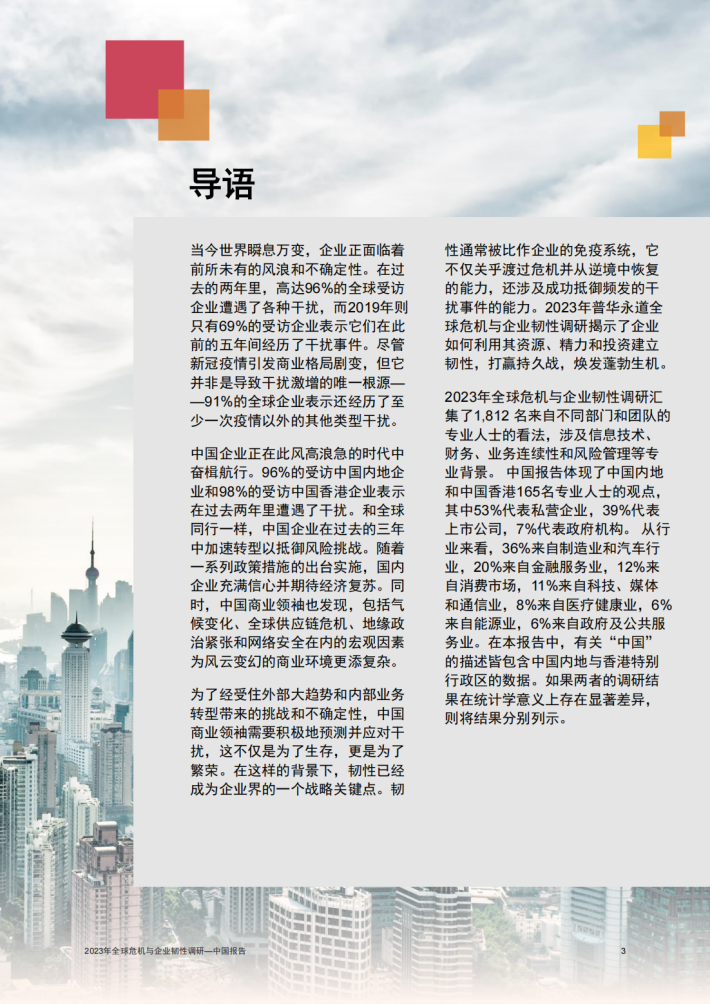 2023年全球危机与企业韧性调研汇集了1,812名来自不同部门和团队的专业人士的看法,涉及信息技术、财务、业务连续性和风险管理等专业背景。 中国报告体现了中国内地和中国香港165名专业人士的观点,其中53%代表私营企业,39%代表上市公司,7%代表政府机构。从行业来看,36%来自制造业和汽车行业,20%来自金融服务业,12%来自消费市场,11%来自科技、媒体和通信业,8%来自医疗健康业,6%来自能源业,6%来自政府及公共服务业。在本报告中,有关“中国”的描述皆包含中国内地与香港特别行政区的数据。如果两者的调研结果在统计学意义上存在显著差异,则将结果分别列示。