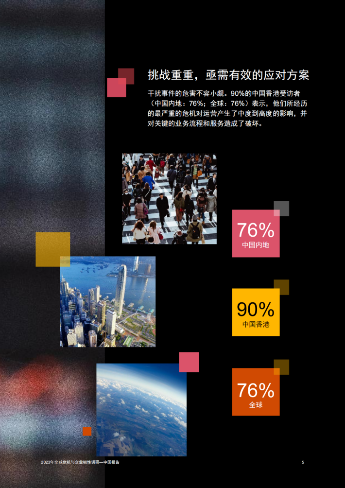 中国企业正在此风高浪急的时代中奋楫航行。96%的受访中国内地企业和98%的受访中国香港企业表示在过去两年里遭遇了干扰。和全球同行一样,中国企业在过去的三年中加速转型以抵御风险挑战。随着一系列政策措施的出台实施,国内企业充满信心并期待经济复苏。同时,中国商业领袖也发现,包括气候变化、全球供应链危机、地缘政治紧张和网络安全在内的宏观因素为风云变幻的商业环境更添复杂。