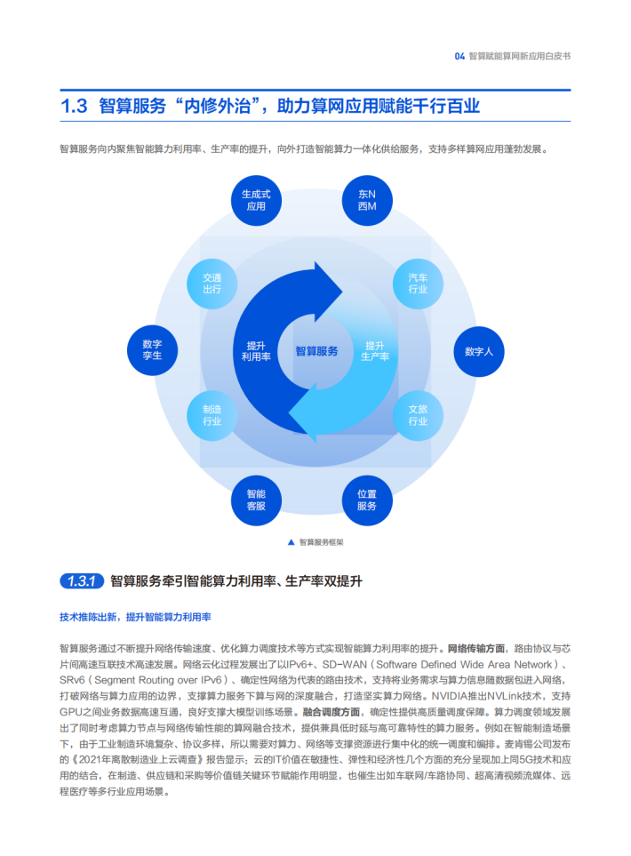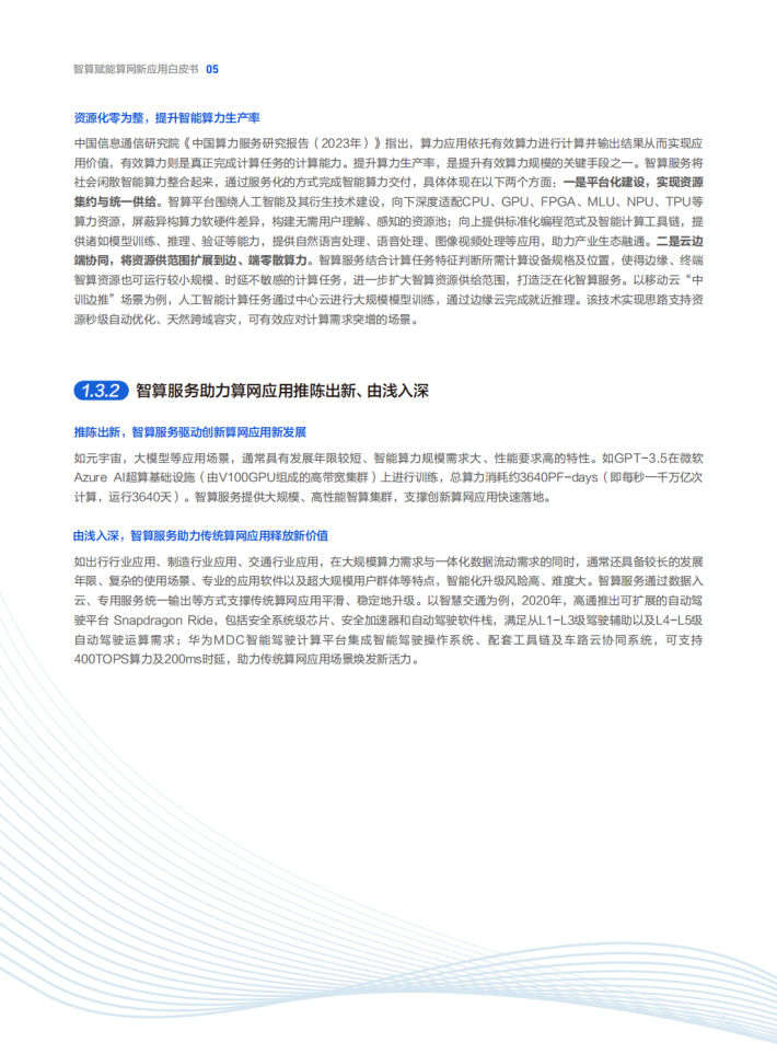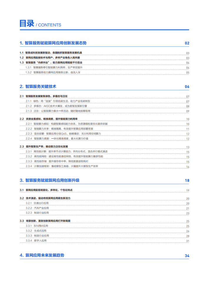 本报告给出算网应用产业发展观察,按照算网应用特性从传统应用与创新应用两方面展开讨论:传统应用依托智算服务实现智能化升级,焕发新活力;创新应用借助智算服务快速发展,强化产业渗透。