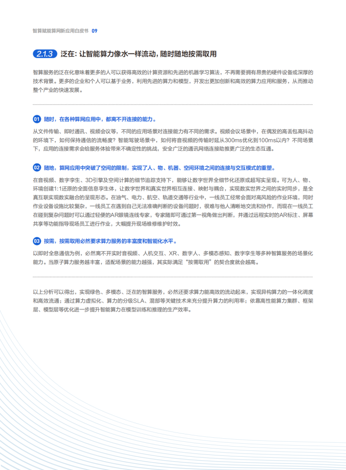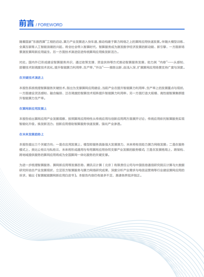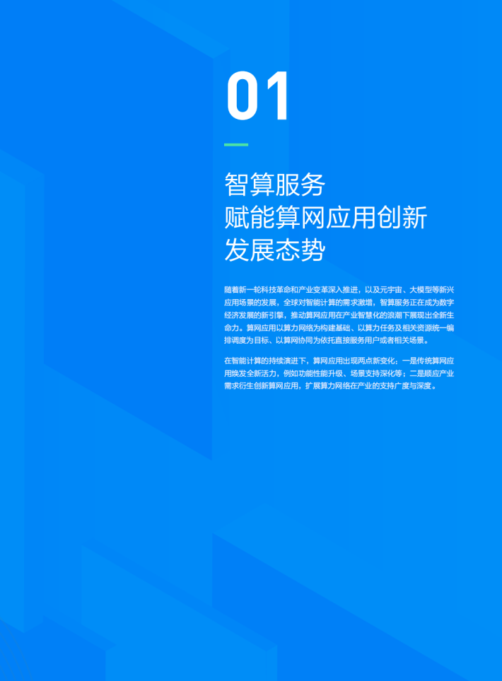 随着国家“东数西算”工程的启动,算力产业发展进入快车道,推动构建于算力网络之上的算网应用快速发展。伴随大模型训练、全真互联等人工智能浪潮的兴起,将全社会带入智算时代,智算服务成为激发数字经济发展的新动能、新引擎,一方面新场景激发算网新应用诞生,另一方面技术演进促进传统算网应用焕发新活力。