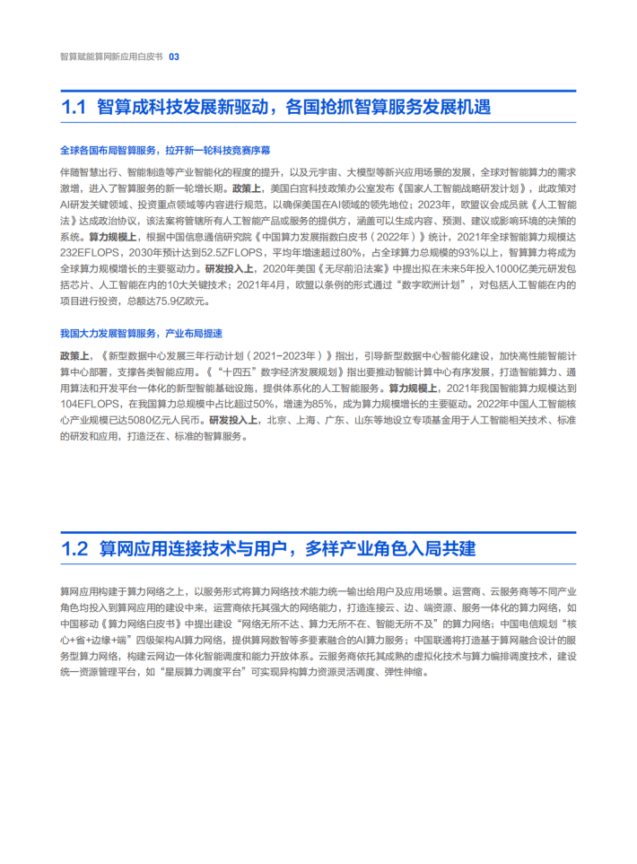 对此,国内外已形成建设智算服务共识,通过政策支撑、资金扶持等方式推动智算服务发展,助力其“内修”——从感知、部署技术到调度技术优化,提升智能算力利用率、生产率,“外治”——推陈出新、由浅入深,扩展算网应用场景支持广度与深度。