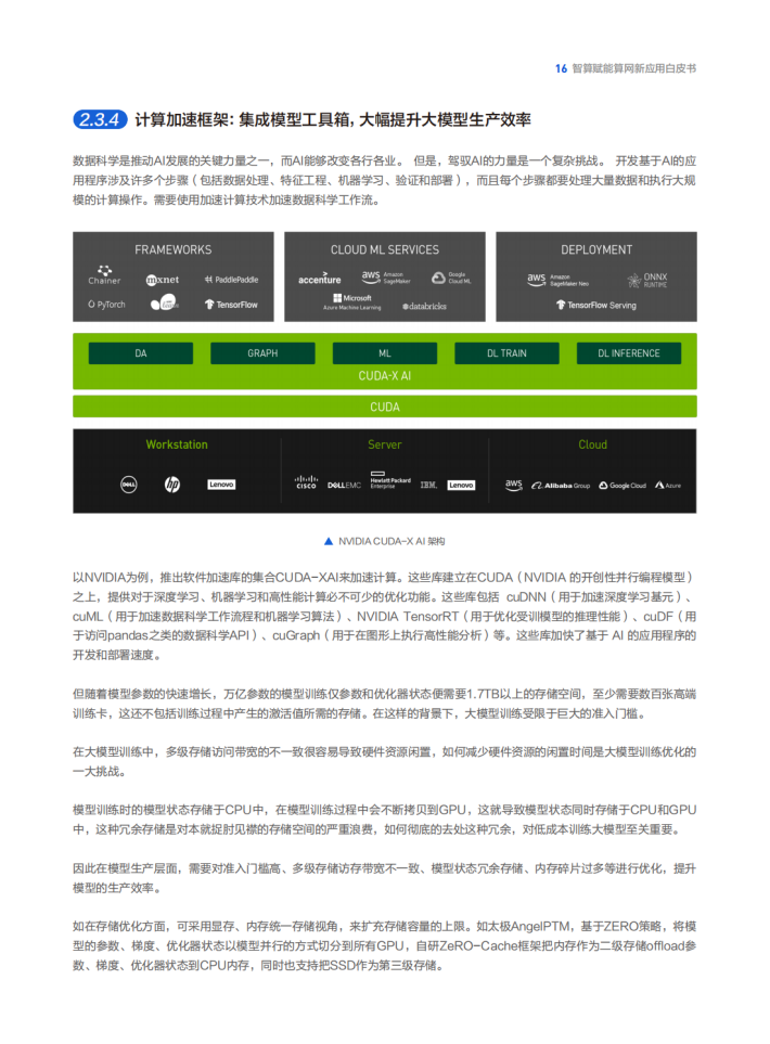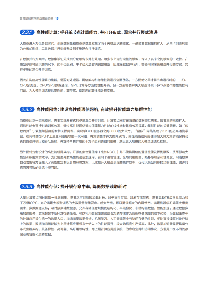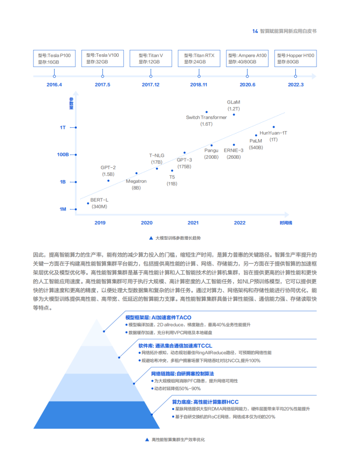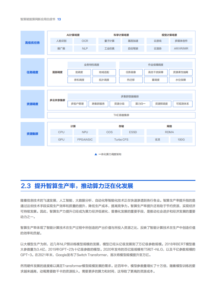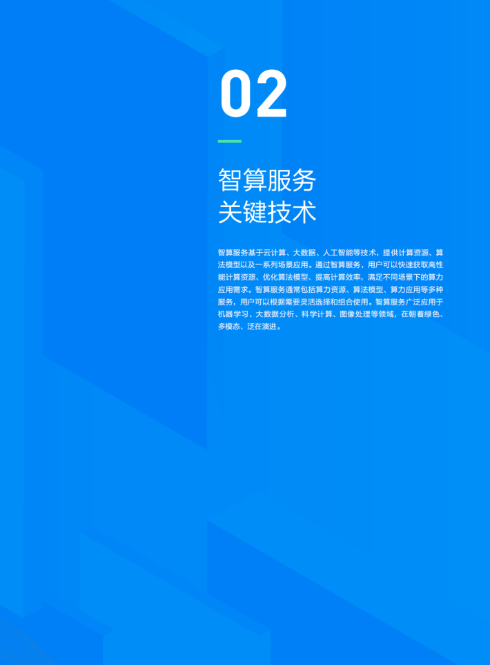 本报告系统梳理智算服务关键技术,指出为支撑算网应用建设,当前产业在提升智能算力利用率、生产率上的发展重点与现状:一方面建设灵活感知、融合编排、泛在调度的智算技术矩阵提升智能算力利用率,另一方面打造大规模、高性能智算集群提升智能算力生产率。