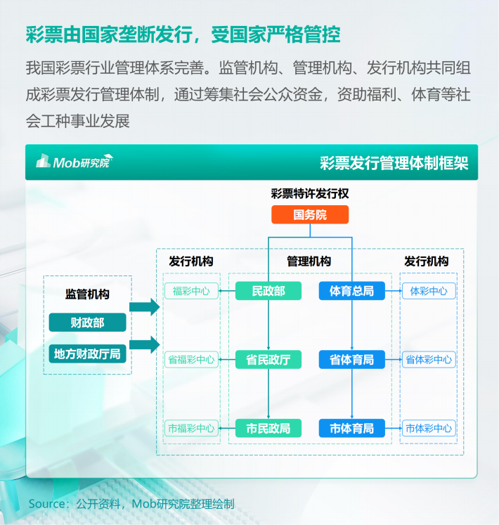 我国彩票行业管理体系完善。监管机构、管理机构、发行机构共同组成彩票发行管理体制,通过筹集社会公众资金,资助福利、体育等社会工种事业发展