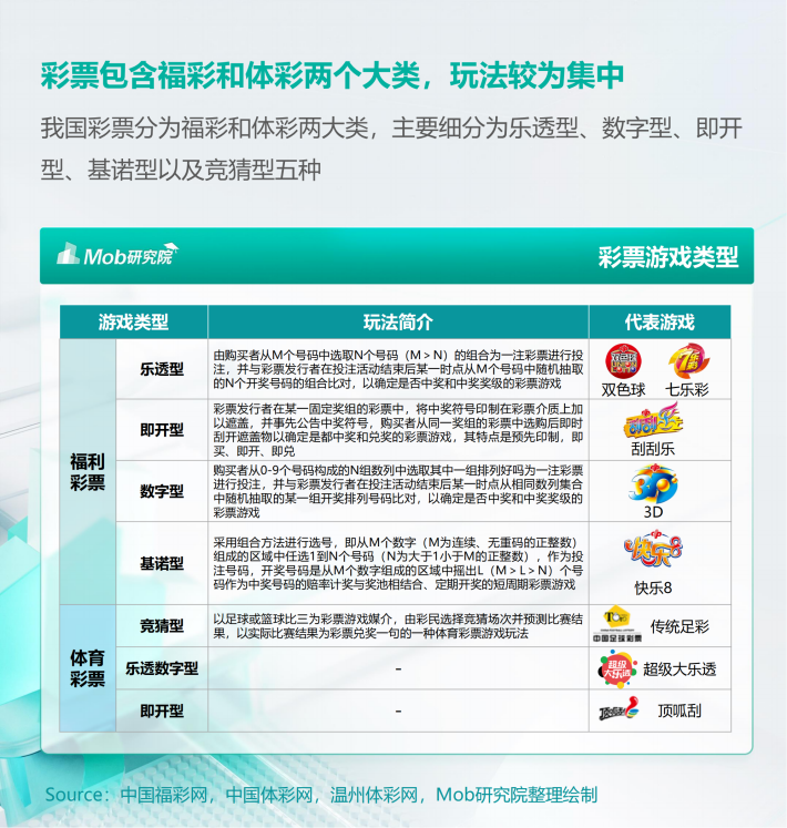 我国彩票分为福彩和体彩两大类,主要细分为乐透型、数字型、即开型、基诺型以及竞猜型五种
