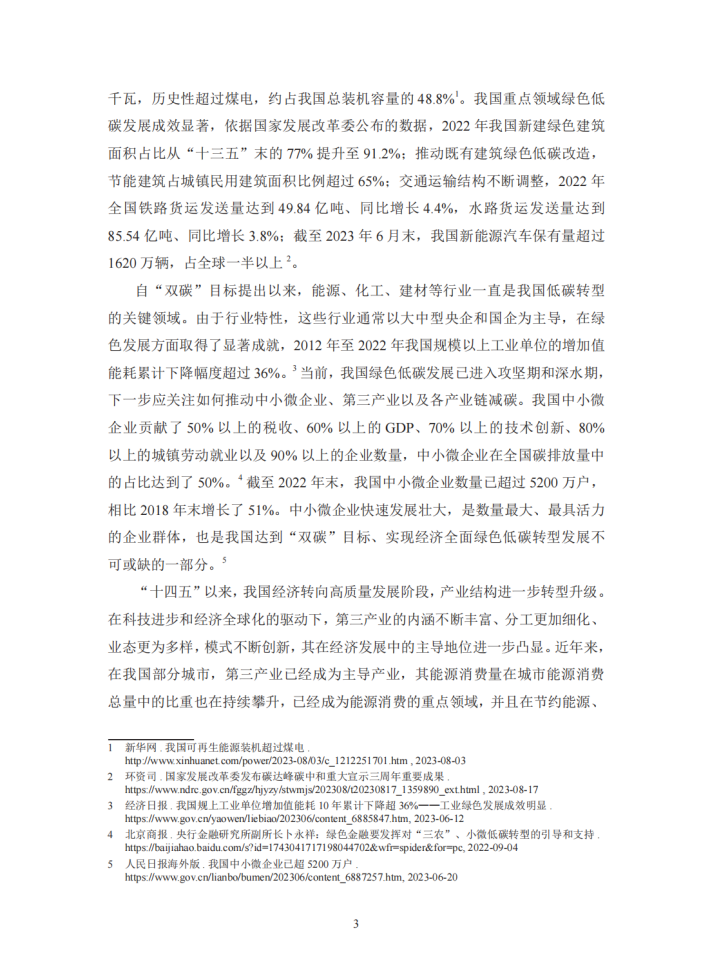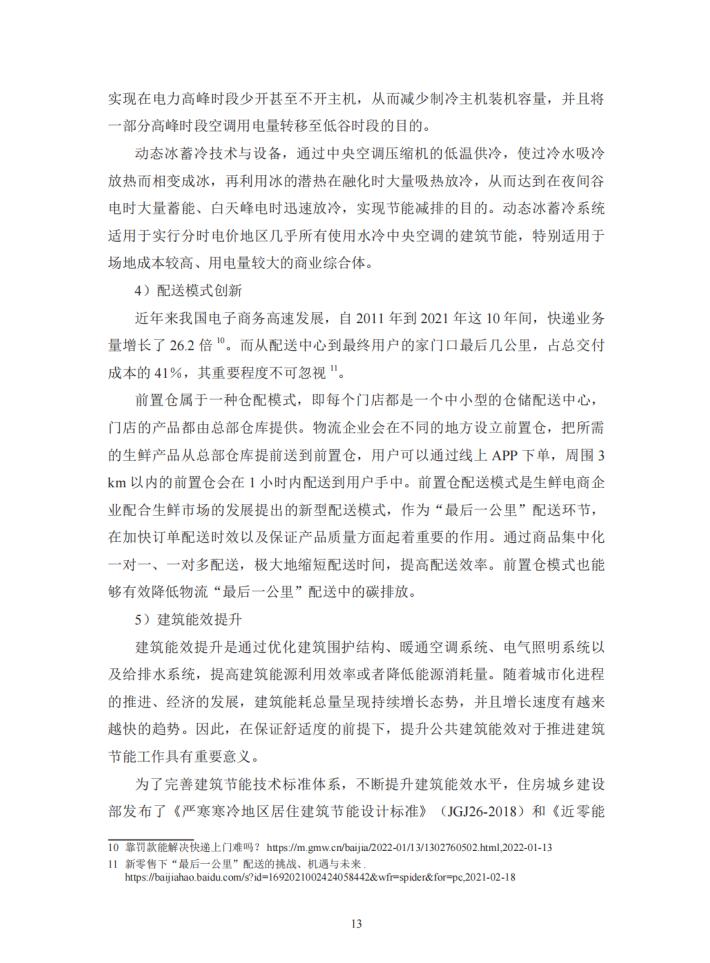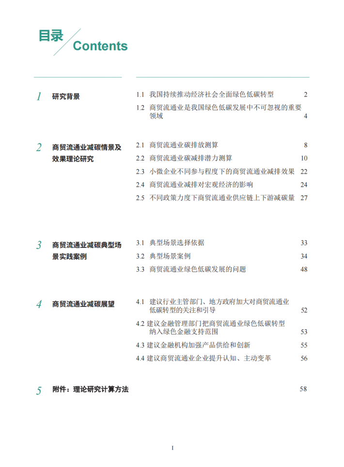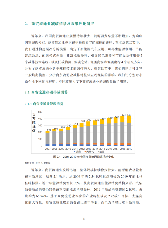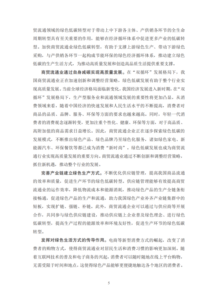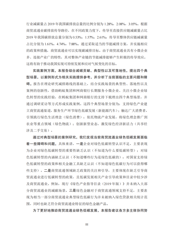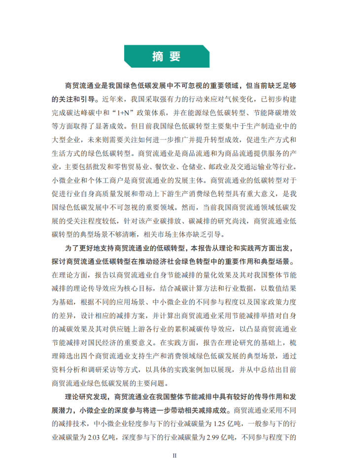 为了更好地支持商贸流通业的低碳转型,本报告从理论和实践两方面出发,探讨商贸流通业低碳转型在推动经济社会绿色转型中的重要作用和典型场景。在理论方面,报告以商贸流通业自身节能减排的量化效果及其对我国整体节能减排的理论传导效应为核心目标,结合减碳计算方法和行业数据,以数值结果为基础,根据不同的应用场景、中小微企业的不同参与程度以及国家政策力度的差异,设计相应的减排方案,并计算出商贸流通业采用节能减排举措对自身的减碳效果及其对供应链上游各行业的累积减碳传导效应,以凸显商贸流通业节能减排对国民经济的重要意义。在实践方面,报告在理论研究的基础上,梳理筛选出四个商贸流通业支持生产和消费领域绿色低碳发展的典型场景,通过资料分析和调研采访等方式,以具体的实践案例加以展现,并从中总结出目前商贸流通业绿色低碳发展的主要问题。