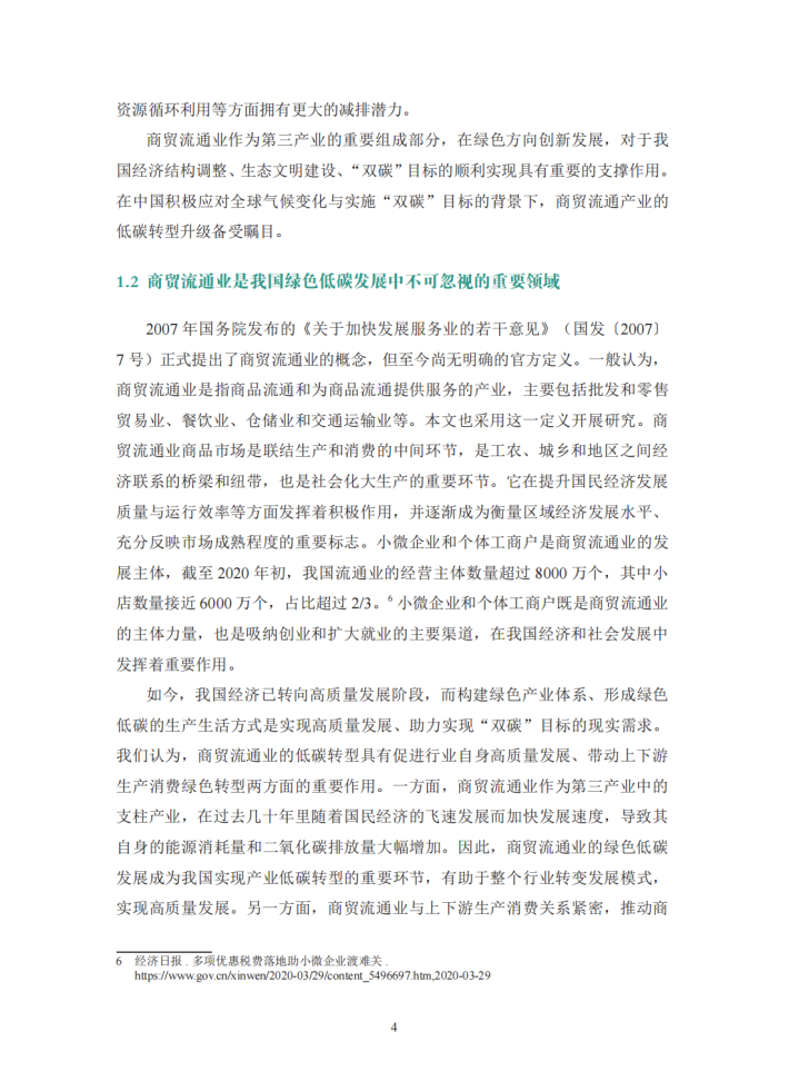 商贸流通业是我国绿色低碳发展中不可忽视的重要领域,但当前缺乏足够的关注和引导。近年来,我国采取强有力的行动来应对气候变化,已初步构建完成碳达峰碳中和“1+N”政策体系,并在能源绿色低碳转型、节能降碳增效等方面取得了显著成效。但目前我国绿色低碳转型主要集中于生产制造业中的大型企业,未来则需要关注如何进一步推广并提升转型成效,促进生产方式和生活方式的绿色低碳转型。商贸流通业是商品流通和为商品流通提供服务的产业,主要包括批发和零售贸易业、餐饮业、仓储业、邮政业及交通运输业等行业。小微企业和个体工商户是商贸流通业的发展主体。商贸流通业的低碳转型对于促进行业自身高质量发展和带动上下游生产消费绿色转型具有重大意义,是我国绿色低碳发展中不可忽视的重要领域。然而,当前我国商贸流通领域低碳发展的受关注程度较低,针对该产业碳排放、碳减排的研究尚浅,商贸流通业低碳转型的典型场景不够清晰,相关市场主体亦缺乏引导。