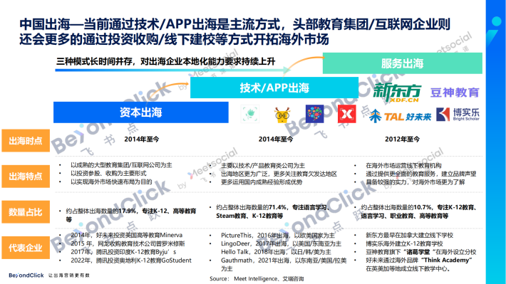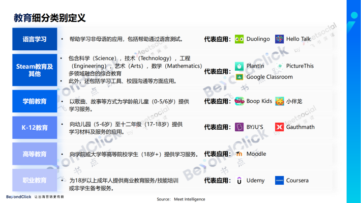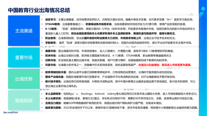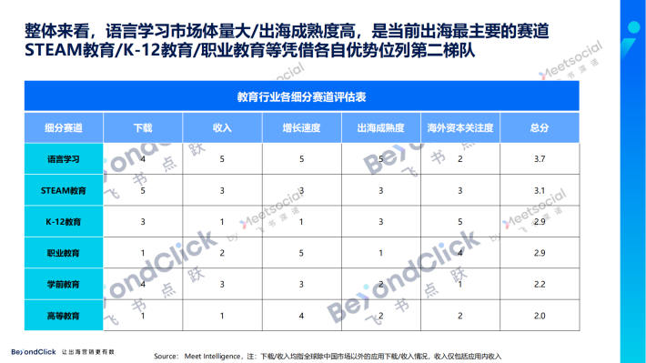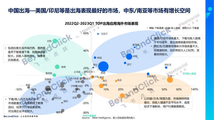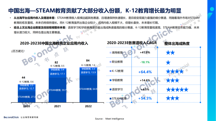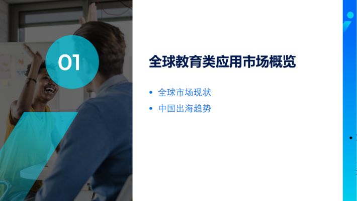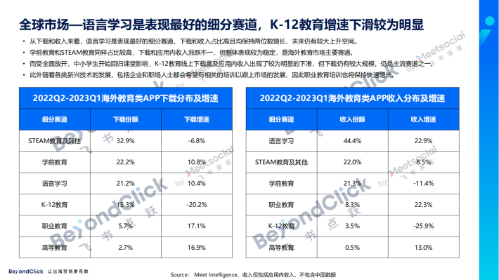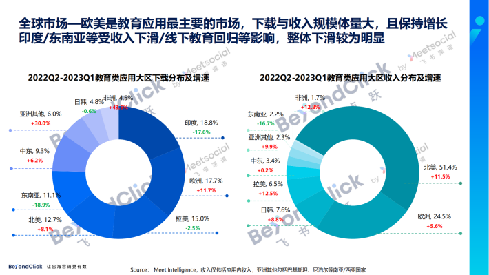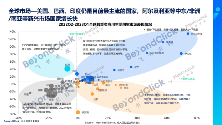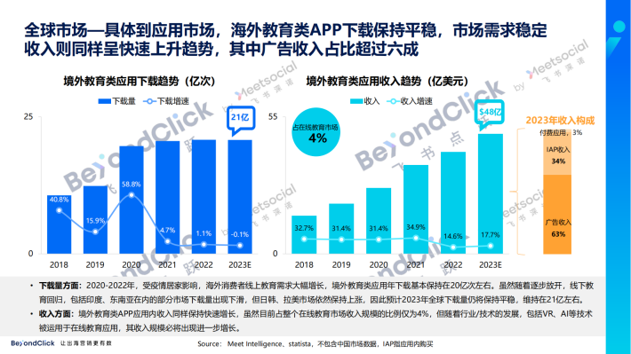 下载量方面:2020-2022年,受疫情居家影响,海外消费者线上教育需求大幅增长,境外教育类应用年下载基本保持在20亿次左右。虽然随着逐步放开,线下教育回归,包括印度、东南亚在内的部分市场下载量出现下滑,但日韩、拉美市场依然保持上涨,因此预计2023年全球下载量仍将保持平稳,维持在21亿左右。收入方面:境外教育类APP应用内收入同样保持快速增长,虽然目前占整个在线教育市场收入规模的比例仅为4%,但随着行业/技术的发展,包括VR、AI等技术被运用于在线教育应用,其收入规模必将出现进一步增长。