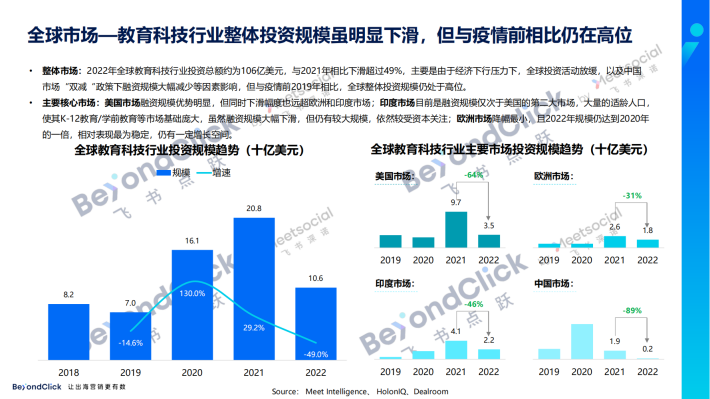 主要核心市场:美国市场融资规模优势明显,但同时下滑幅度也远超欧洲和印度市场;印度市场目前是融资规模仅次于美国的第二大市场,大量的适龄人口,使其K-12教育/学前教育等市场基础庞大,虽然融资规模大幅下滑,但仍有较大规模,依然较受资本关注;欧洲市场降幅最小,且2022年规模仍达到2020年的一倍,相对表现最为稳定,仍有一定增长空间。