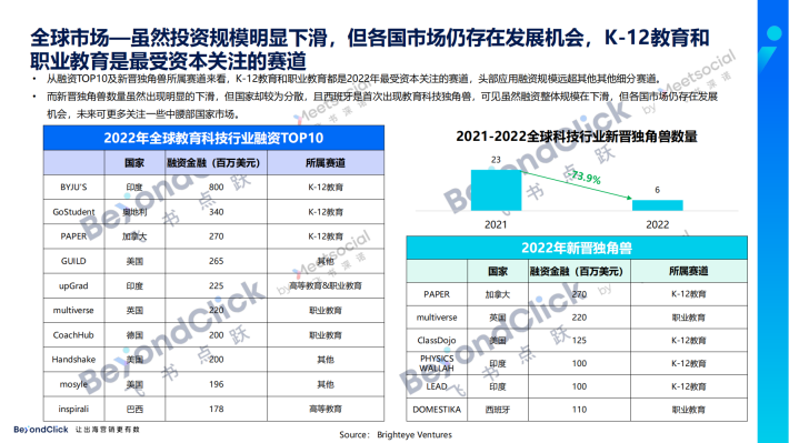 而新晋独角兽数量虽然出现明显的下滑,但国家却较为分散,且西班牙是首次出现教育科技独角兽,可见虽然融资整体规模在下滑,但各国市场仍存在发展机会,未来可更多关注一些中腰部国家市场。