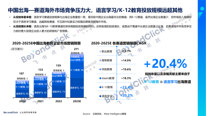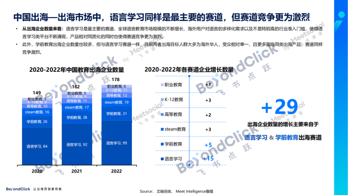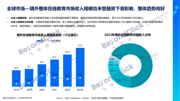 从收入规模来看:境外在线教育市场收入并未受到融资规模下滑影响,整体依然保持两位数快速增长,预计2023年将突破1200亿美元。