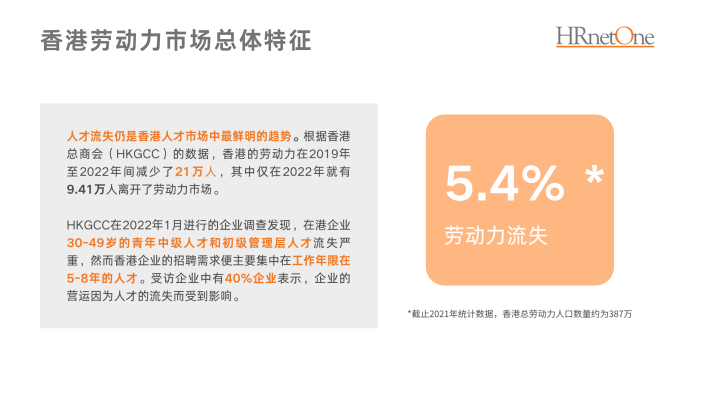 人才流失仍是香港人才市场中最鲜明的趋势。根据香港总商会(HKGCC)的数据,香港的劳动力在2019年至2022年间减少了21万人,其中仅在2022年就有9.41万人离开了劳动力市场。