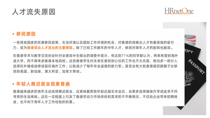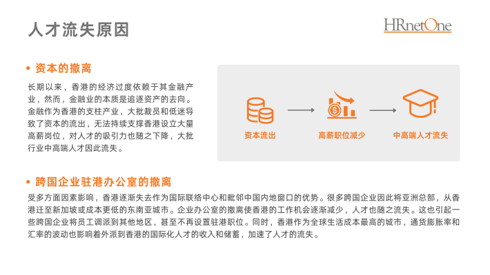 受多方面因素影响,香港逐渐失去作为国际联络中心和毗邻中国内地窗口的优势。很多跨国企业因此将亚洲总部,从香港迁至新加坡或成本更低的东南亚城市。企业办公室的撤离使香港的工作机会逐渐减少,人才也随之流失。这也引起一些跨国企业将员工调派到其他地区,甚至不再设置驻港职位。同时,香港作为全球生活成本最高的城市,通货膨胀率和汇率的波动也影响着外派到香港的国际化人才的收入和储蓄,加速了人才的流失。