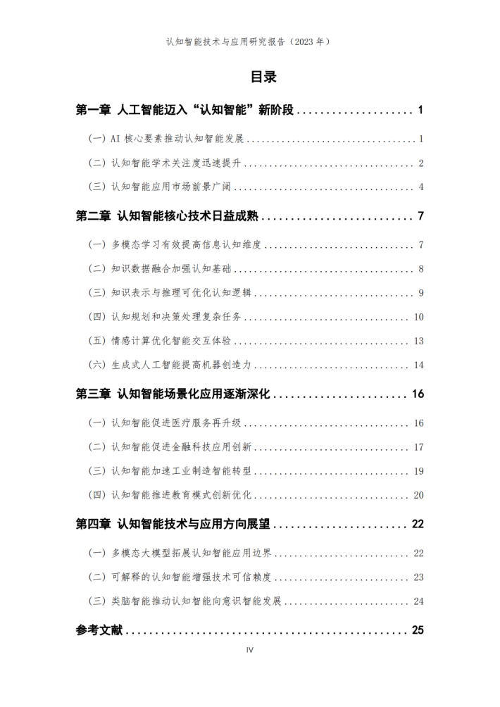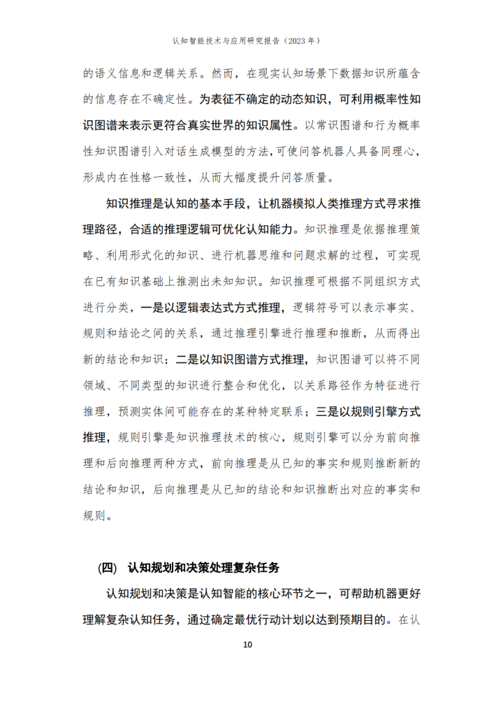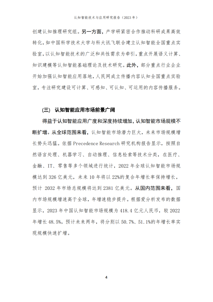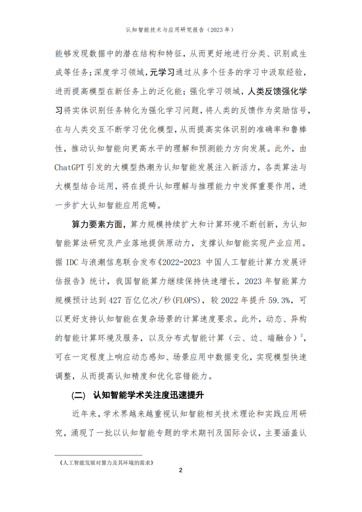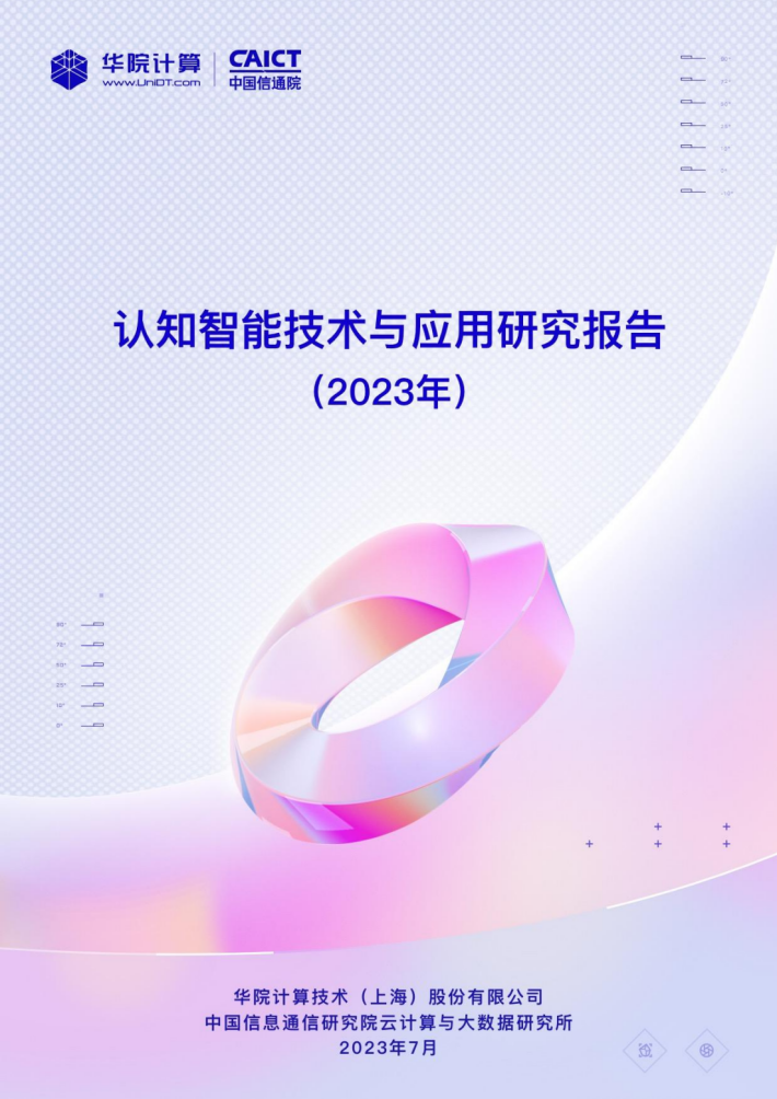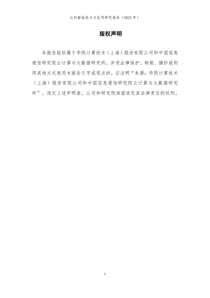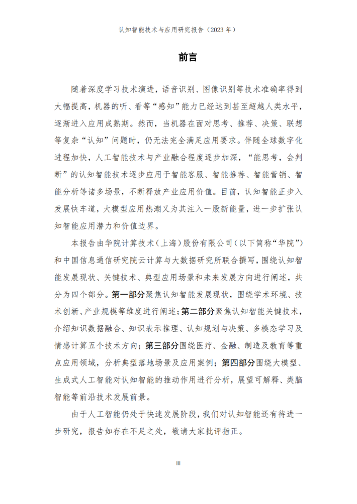 本报告由华院计算技术(上海)股份有限公司(以下简称“华院”)和中国信息通信研究院云计算与大数据研究所联合撰写,围绕认知智能发展现状、关键技术、典型应用场景和未来发展方向进行阐述,共分为四个部分。第一部分聚焦认知智能发展现状,围绕学术环境、技术创新、产业规模等维度进行阐述;第二部分聚焦认知智能关键技术,介绍知识数据融合、知识表示推理、认知规划与决策、多模态学习及情感计算五个技术方向;第三部分围绕医疗、金融、制造及教育等重点应用领域,分析典型落地场景及应用案例;第四部分围绕大模型、生成式人工智能对认知智能的推动作用进行分析,展望可解释、类脑智能等前沿技术发展前景。