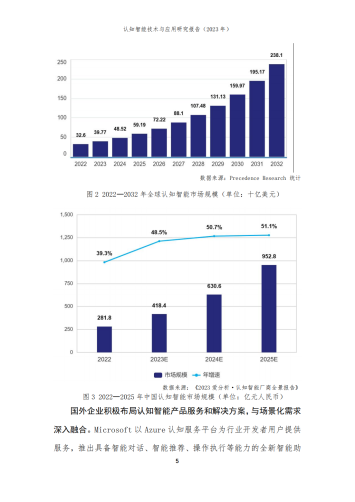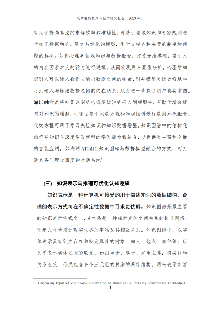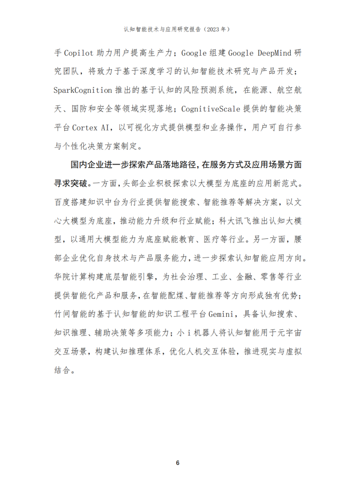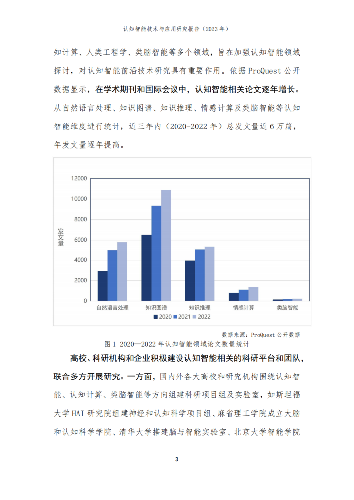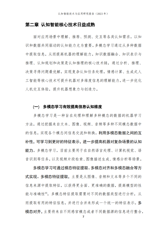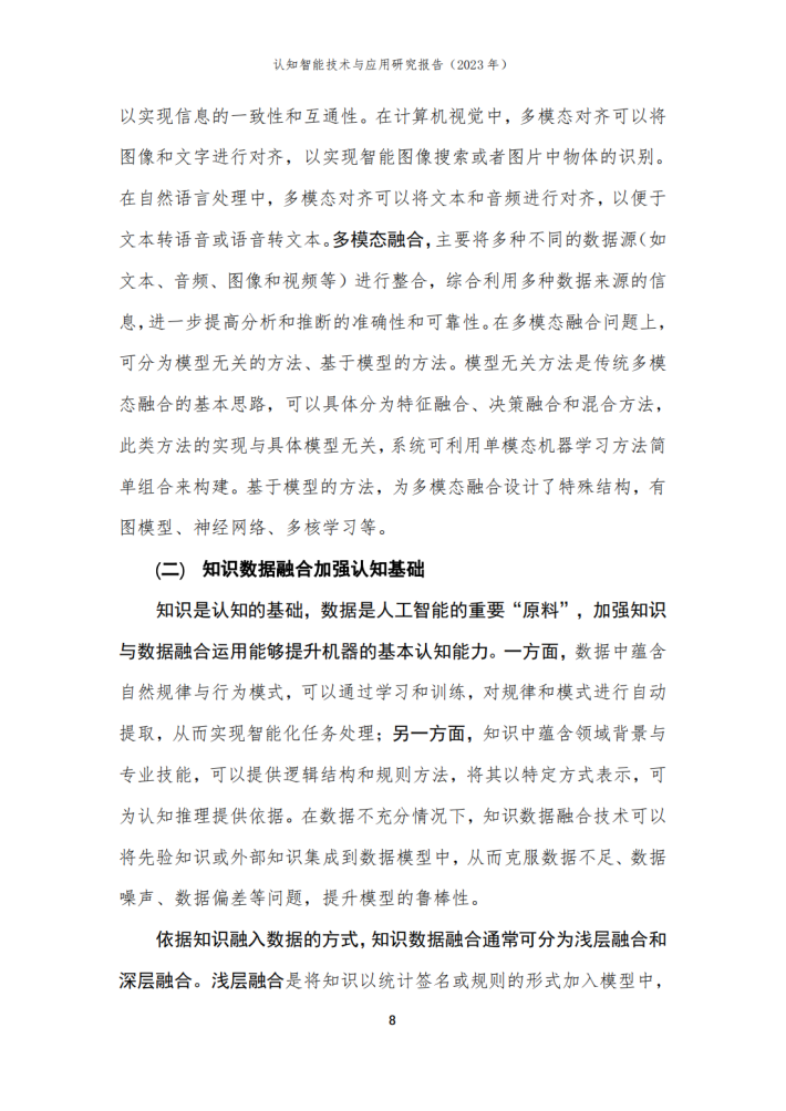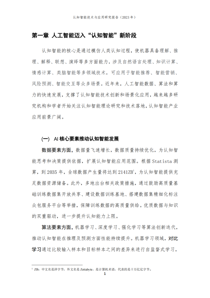 本报告由华院计算技术(上海)股份有限公司(以下简称“华院”)和中国信息通信研究院云计算与大数据研究所联合撰写,围绕认知智能发展现状、关键技术、典型应用场景和未来发展方向进行阐述,共分为四个部分。第一部分聚焦认知智能发展现状,围绕学术环境、技术创新、产业规模等维度进行阐述;第二部分聚焦认知智能关键技术,介绍知识数据融合、知识表示推理、认知规划与决策、多模态学习及情感计算五个技术方向;第三部分围绕医疗、金融、制造及教育等重点应用领域,分析典型落地场景及应用案例;第四部分围绕大模型、生成式人工智能对认知智能的推动作用进行分析,展望可解释、类脑智能等前沿技术发展前景。
