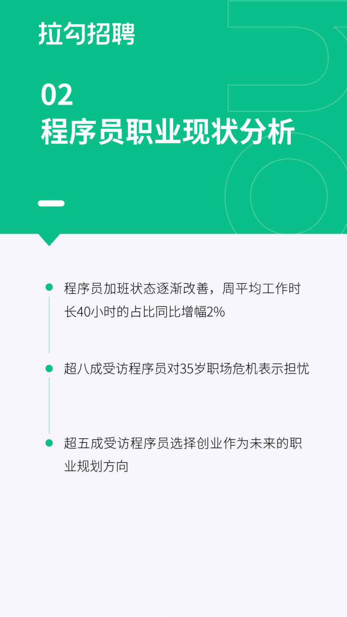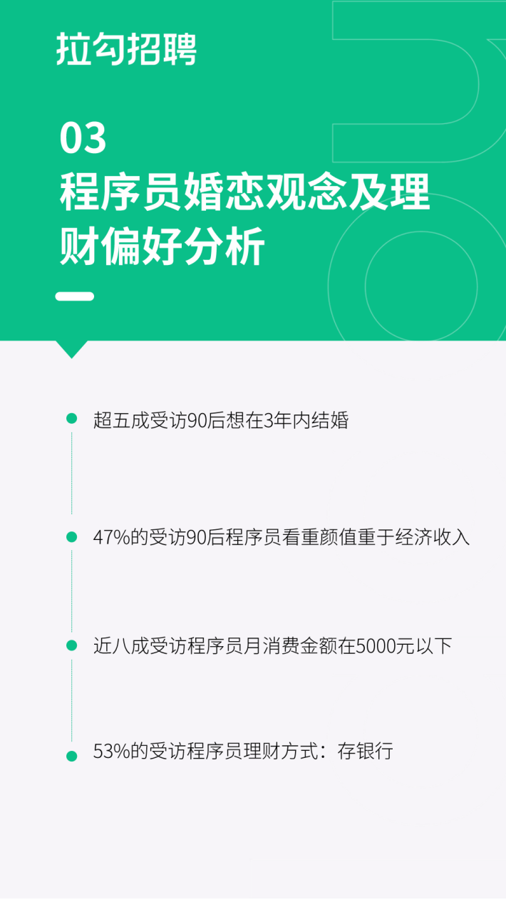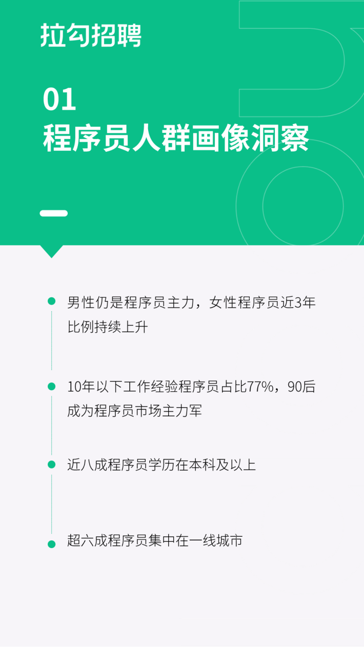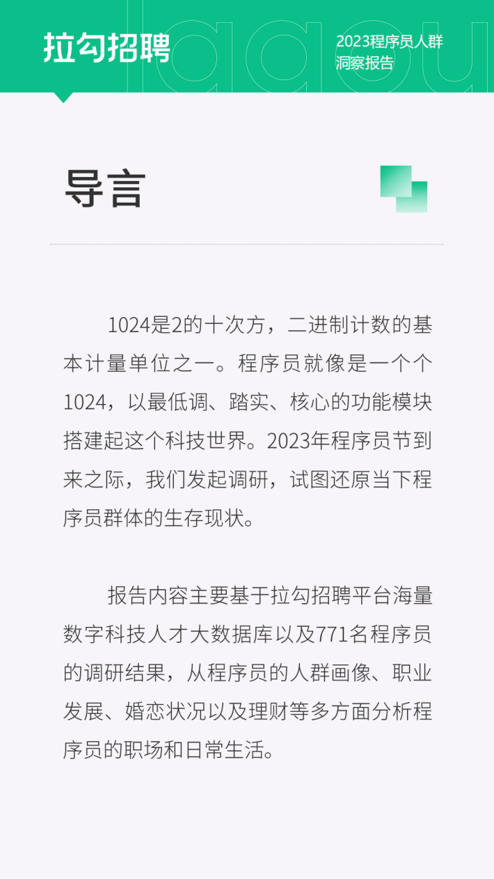 报告内容主要基于拉勾招聘平台海量数字科技人才大数据库以及771名程序员的调研结果,从程序员的人群画像、职业发展、婚恋状况以及理财等多方面分析程序员的职场和日常生活。