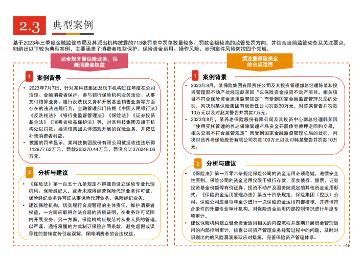 国家金融监督管理总局(下文简称“金融监管总局”)公布的保险业经营数据显示,2023年1-8月原保险保费收入合计3.87万亿元,同比增长11.88%。为了贯彻落实党的二十大提出的加强和完善现代金融监管,强化金融稳定保障体系以及切实维护好金融消费者的合法权益的重要举措,金融监管总局本季度持续加强对金融机构的监督管理。本季度金融监管总局对保险业的监管强调加强风险防线治理架构的建设以及管理责任的落实,完善风险管理活动。此外,金融监管总局的李云泽局长在2023年9月金融消费者权益保护教育宣传月活动启动仪式上强调持续做好金融消费者权益保护工作的重要性,同时要求加强金融消费者权益保护教育宣传,营造公平、有序的良好金融环境。
