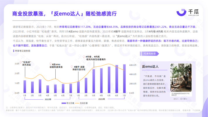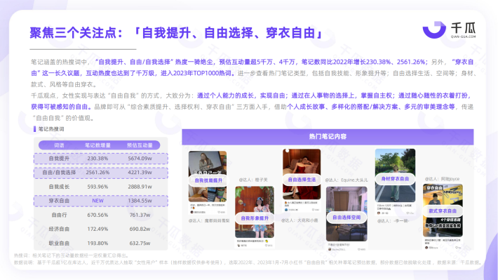 通过对小红书站内女性生活、工作、社交、亲密关系、期望等方面的内容共性调研,经过数据筛选、整合,千瓜总结出5个典型标签:自由自我、独立勇敢、松弛从容、智识清醒、纯粹真我