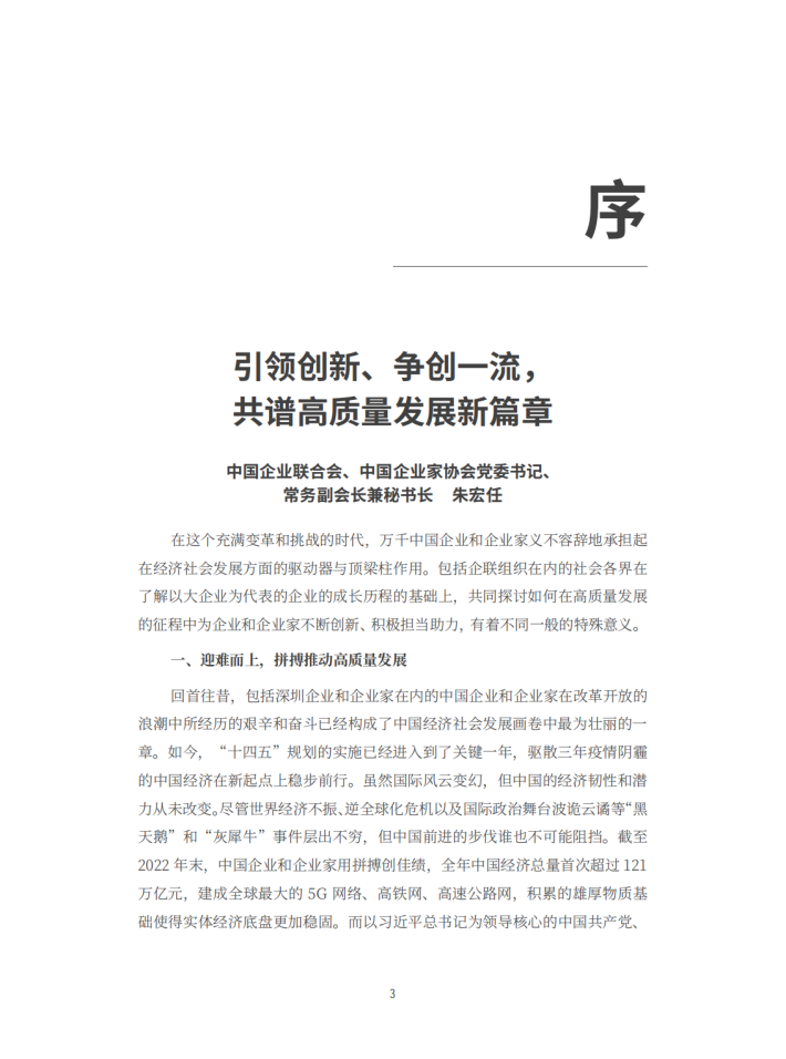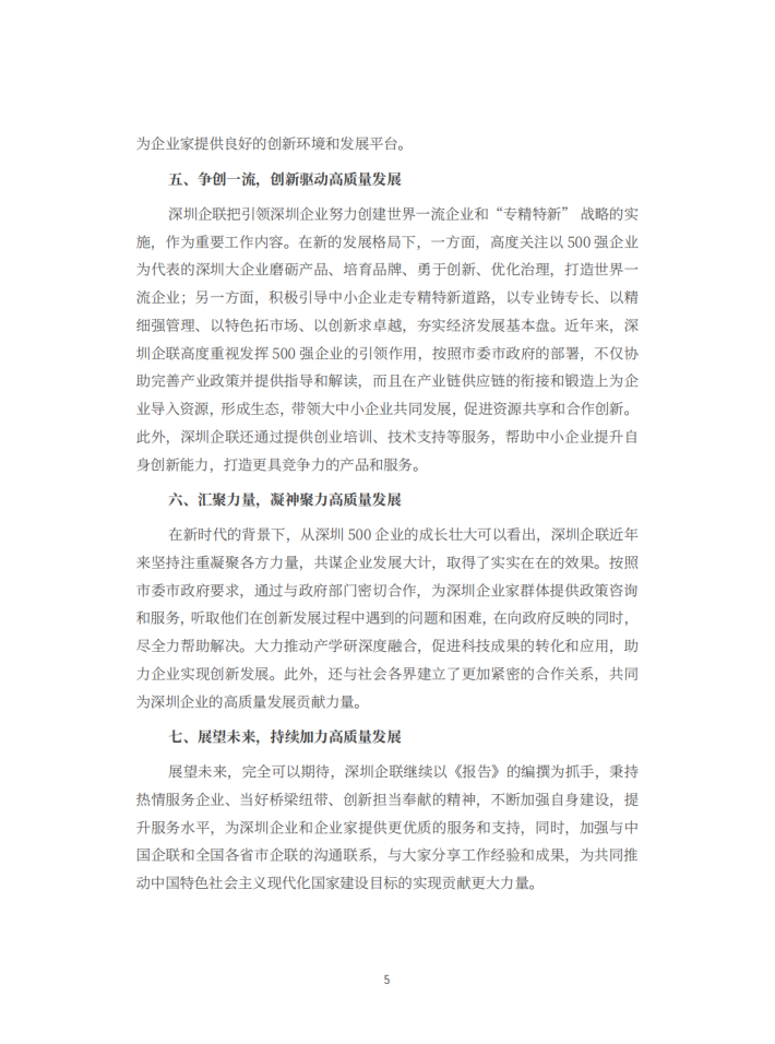 结合现下大国竞争与博弈更趋激烈、全球经济形势不容乐观、复苏进程缓慢且脆弱、中国加快建设“统一大市场”和构建“双循环”新发展格局,深圳进入“双区”驱动、 “双区”叠加、 “双改”示范黄金发展期等时代背景和时代使命,深圳500强企业必须更开放、强创新、广合作、深改革,既打好防范和抵御风险的有准备之战,也打好化险为夷、转危为机的战略主动战,更好地应对企业发展难题、提振发展信心,更好地发挥其支撑城市功能定位、城市发展目标、城市战略选项的重要作用。