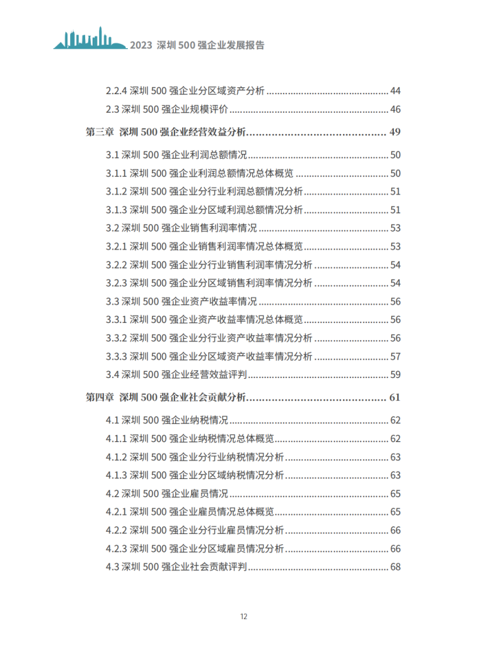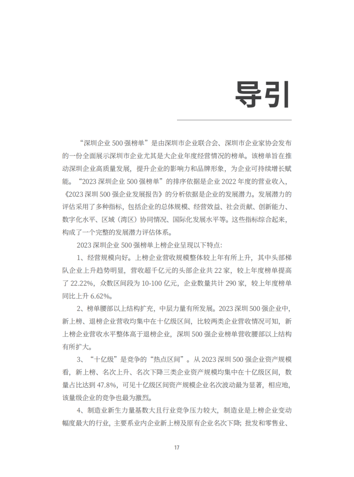 “深圳企业500强榜单”是由深圳市企业联合会、深圳市企业家协会发布的一份全面展示深圳市企业尤其是大企业年度经营情况的榜单。该榜单旨在推动深圳企业高质量发展,提升企业的影响力和品牌形象,为企业可持续增长赋能。“2023深圳企业500强榜单”的排序依据是企业2022年度的营业收入,《2023深圳500强企业发展报告》的分析依据是企业的发展潜力。发展潜力的评估采用了多种指标,包括企业的总体规模、经营效益、社会贡献、创新能力、数字化水平、区域(湾区)协同情况、国际化发展水平等。这些指标综合起来,构成了一个完整的发展潜力评估体系。