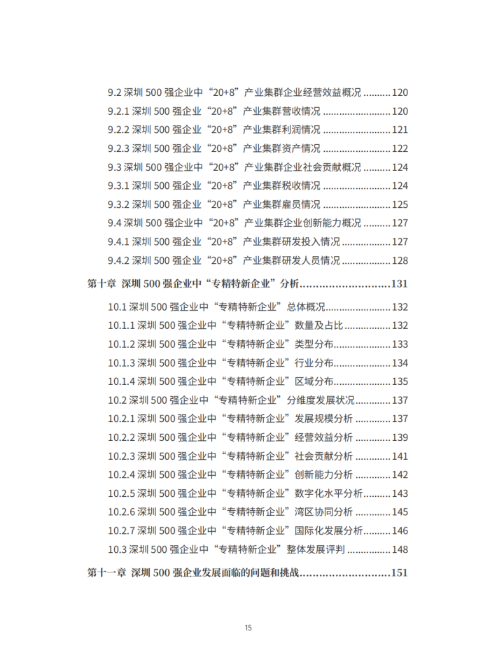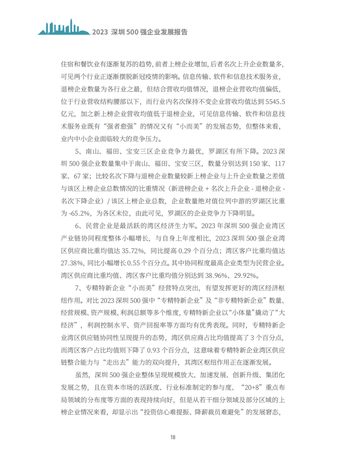 7、专精特新企业“小而美”经营特点突出,有望发挥更好的湾区经济枢纽作用。对比2023深圳500强中“专精特新企业”及“非专精特新企业”数量、经营规模、资产规模、利润总额等多个维度,专精特新企业以“小体量”撬动了“大经济”,利润控制水平、资产回报率等方面均有优秀表现。同时,专精特新企业湾区供应链协同性呈现提升的态势,湾区供应商占比均值提高了3个百分点,而湾区客户占比均值则下降了0.93个百分点,这意味着专精特新企业湾区供应链整合能力与“走出去”能力的双向提升,其湾区枢纽作用正在逐渐发展。虽然,深圳500强企业整体呈现规模放大、加速发展、创新升级、集团化发展之势,且在资本市场的活跃度、行业标准制定的参与度、“20+8”重点布局领域的分布度等方面的表现持续向好,但是从若干细分领域及部分区域的上榜企业情况来看,却显示出“投资信心难提振、降薪裁员难避免”的发展窘态,并面临着“国际环境恶化、新冠疫情常态化、细分领域深耕力与产业安全支撑力“不匹配”、产业结构仍有待完善、税收贡献度仍有待提升”等五大主要问题。