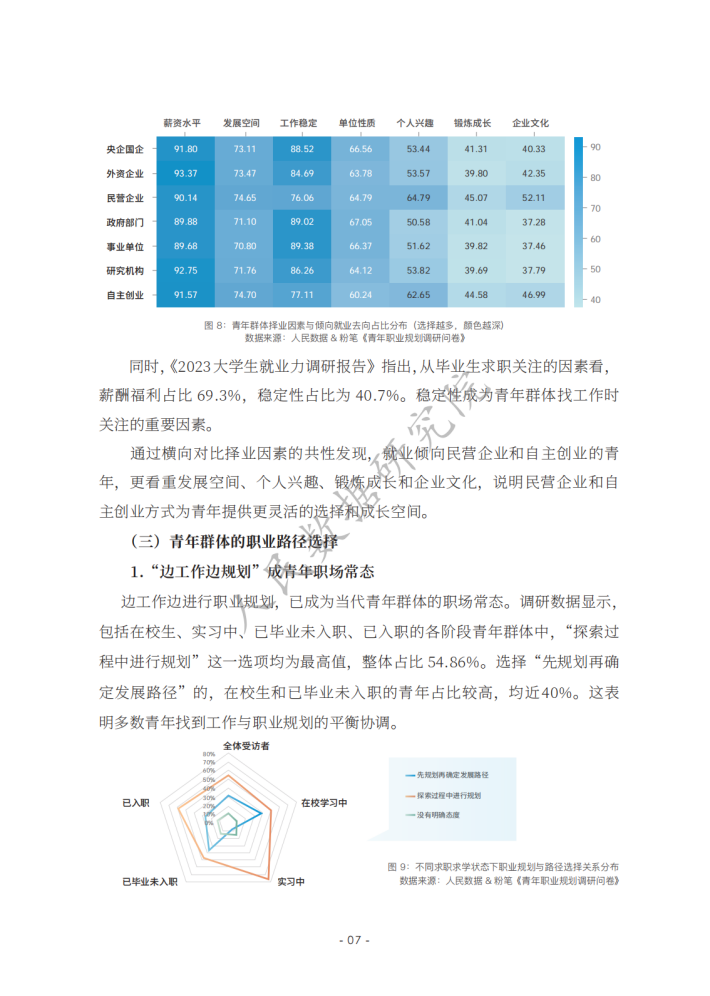 《新时代的中国青年》白皮书指出,青年的职业选择丰富多元,日益市场化、多元化、自主化。相关报道认为,在就业市场不断变化的当下,青年群体在择业上更趋向于稳健,考公务员、考教师资格证、考事业单位等成为不少青年的热门选择。在该过程中,青年群体选择职业培训教育机构等平台提升自己应对职场的能力,如很多青年选择粉笔提高自身考公、考教师、考编方面的能力,找到职业规划的“最优解”;使用智联招聘平台的数据优势和技术优势,提高自己就业能力,发现就业机会等。然而,也有不少青年缺乏职业规划,有研究发现,我国青年群体职业规划意识、相关培训、规划教育的专业性等方面均有待提升。