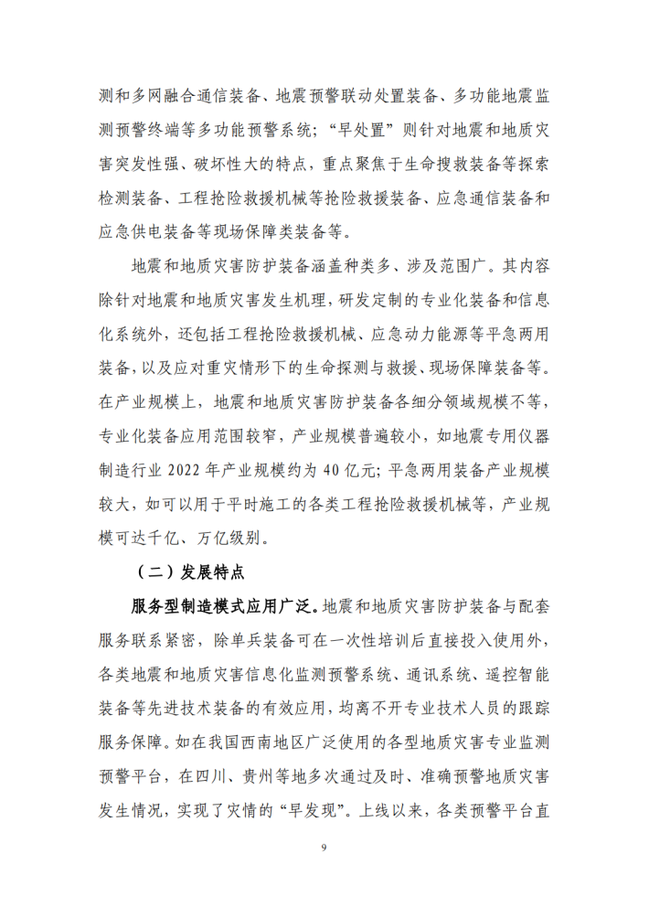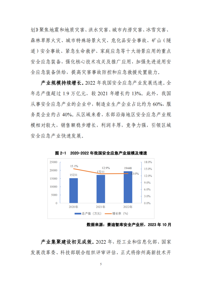 2023年,工业和信息化部、国家发展改革委、科技部、财政部、应急管理部等五部门联合印发《安全应急装备重点领域发展行动计划(2023—2025年)》,明确提出聚焦地震和地质灾害、洪水灾害等十大场景应用的重点安全应急装备,强化核心技术攻关及推广应用,加强先进适用安全应急装备供给,提高灾害事故防控和应急救援处置能力。通过十多年的培养与发展,我国安全应急产业已经形成了一定的发展规模,安全应急装备制造能力不断提升,对突发事件的保障水平也在逐步提高。同时,随着我国构建“以国内大循环为主体、国内国际双循环相互促进”新发展格局,安全应急产业示范基地创建工作的推动,我国安全应急产业区域发展分布已经从“两带一轴”的格局,正在向长三角、粤港澳、京津冀为引领,东中西部协同发展的新局面转变,所支撑和保障的领域也随着国家安全应急管理体系的健全完善。