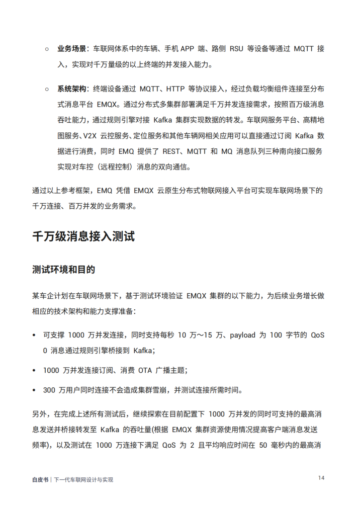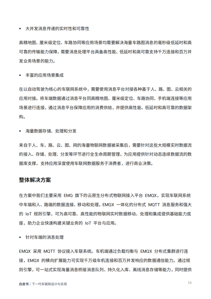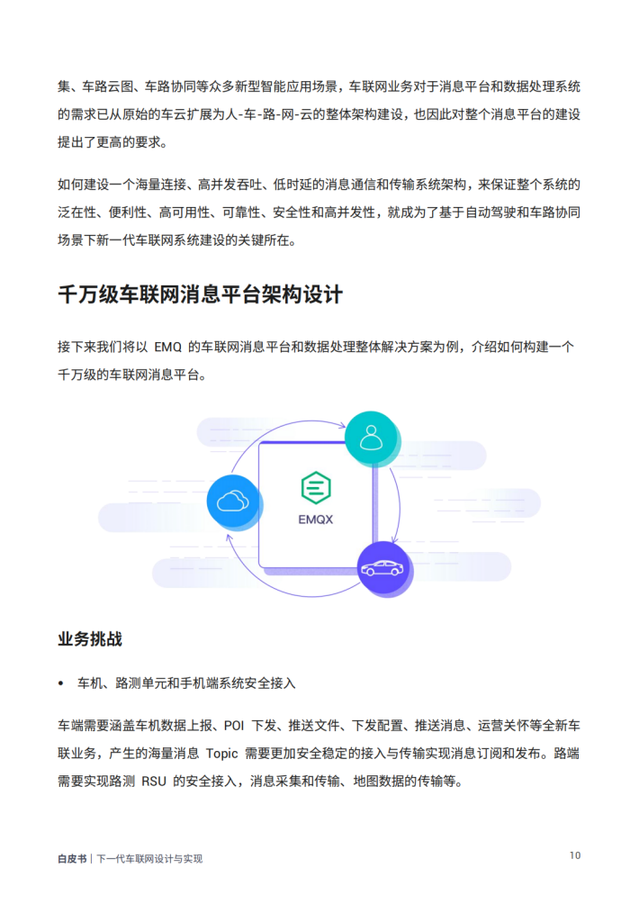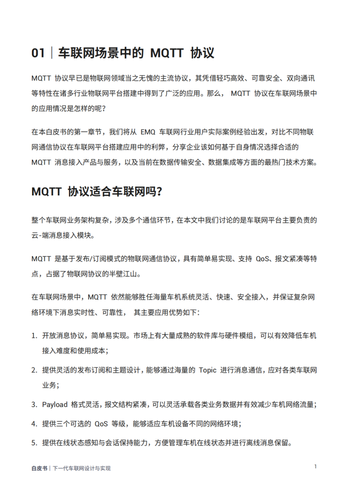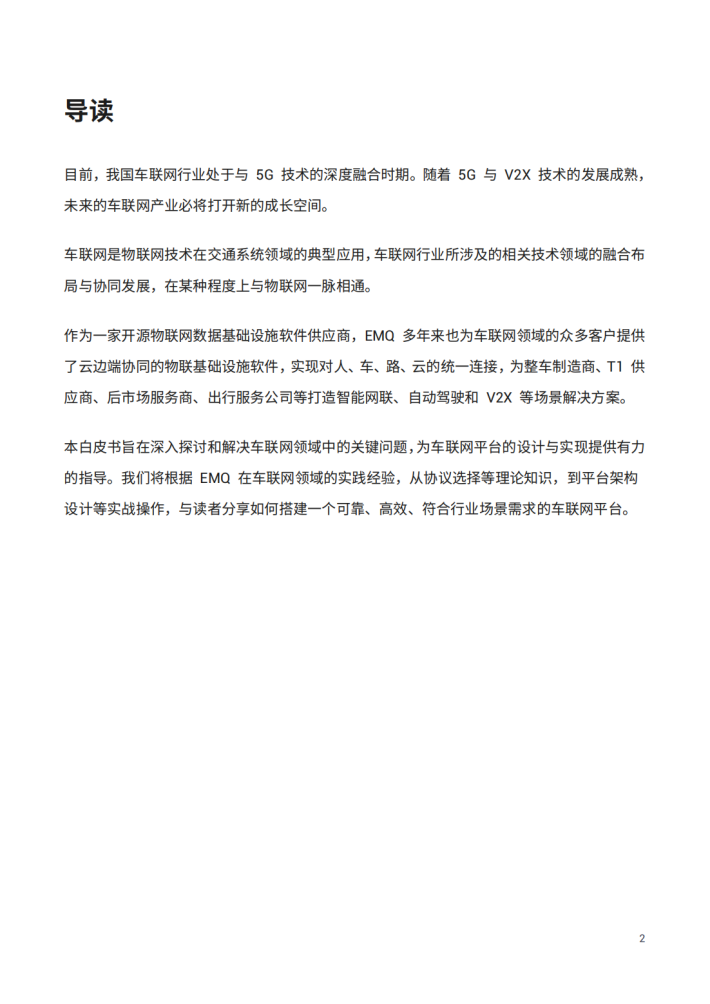本白皮书旨在深入探讨和解决车联网领域中的关键问题,为车联网平台的设计与实现提供有力的指导。我们将根据EMQ在车联网领域的实践经验,从协议选择等理论知识,到平台架构设计等实战操作,与读者分享如何搭建一个可靠、高效、符合行业场景需求的车联网平台。