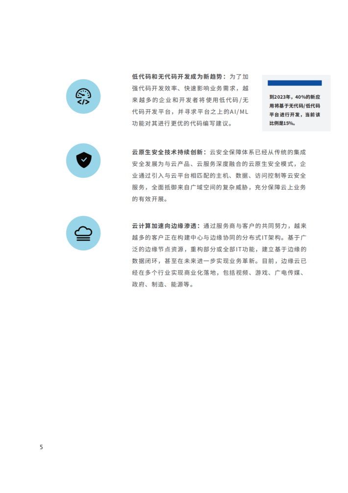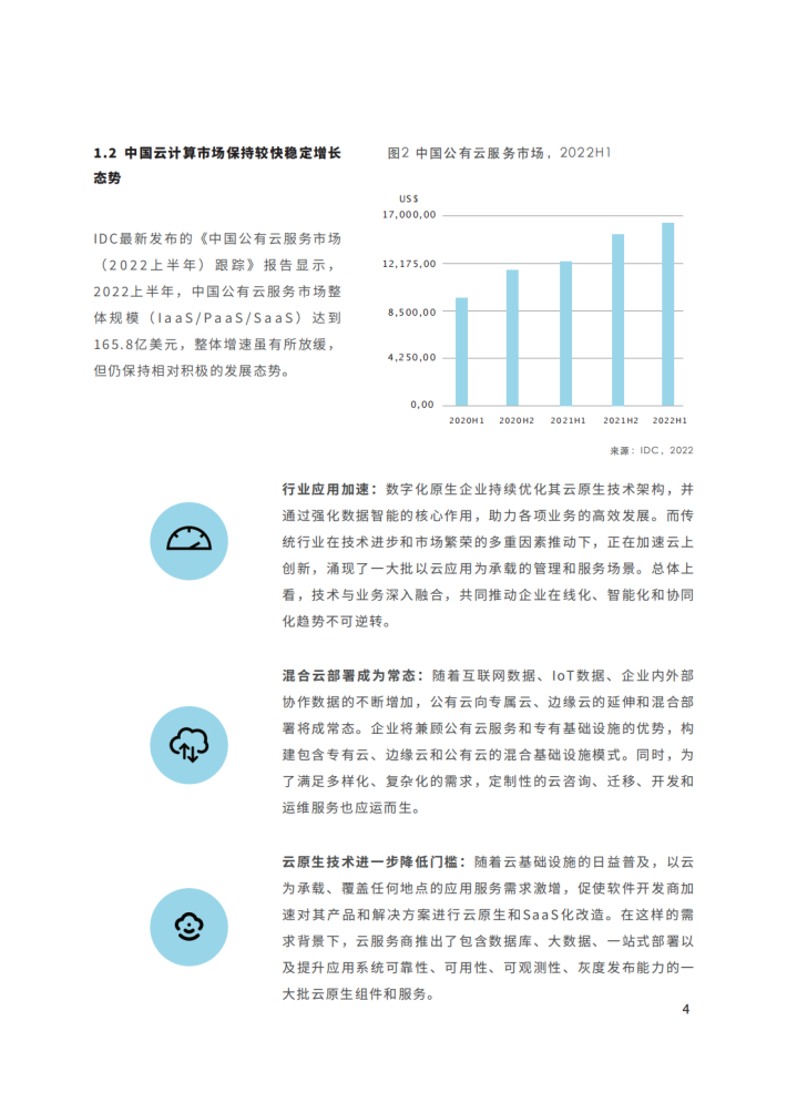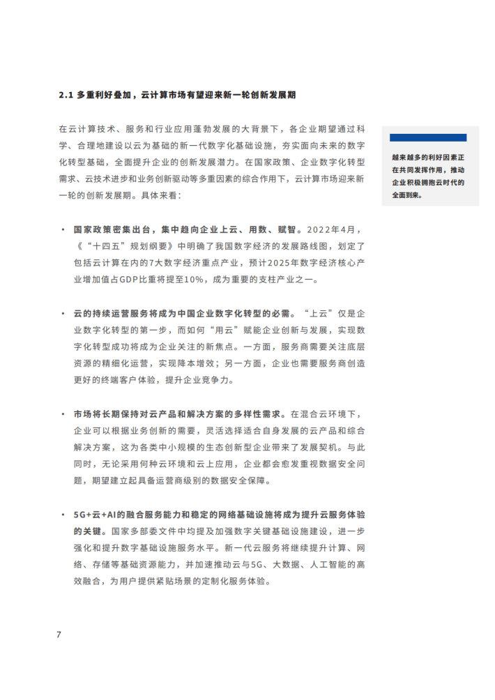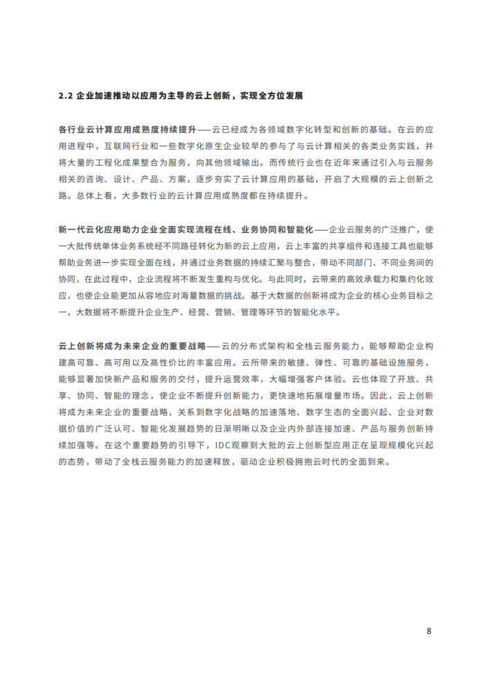 在中国云计算市场持续高速增长的背景下,各行业的云计算应用成熟度稳步提升。云助力企业全面实现流程在线、业务协同和智能化,云上创新已成为未来企业的重要发展战略之一。在政策、需求、技术和业务等多重积极因素的联合推动下,中国云计算市场有望迎来新一轮创新发展期。