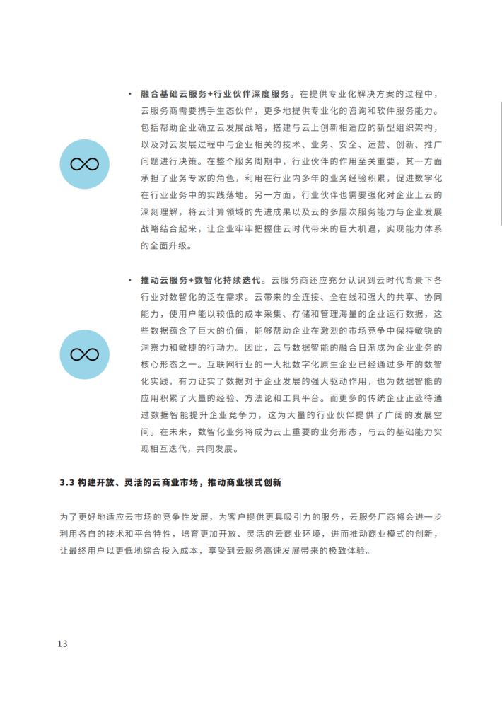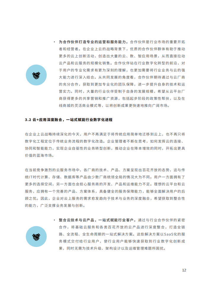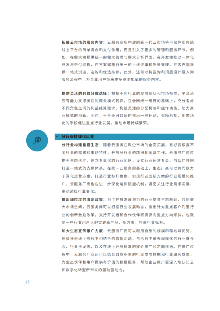 云基础设施和云原生架构的广泛推广,需要由高价值的SaaS创新应用做牵引;云环境的规划、设计、建设、管理、使用过程以及基于云的创新活动,也需要大量的专业化服务团队做支撑,这为多方共建云市场提供了稳定的需求基础。良好的SaaS应用生态体系,有利于激活创新动力,助力生态创新型企业健康发展,实现云计算市场的长期繁荣。