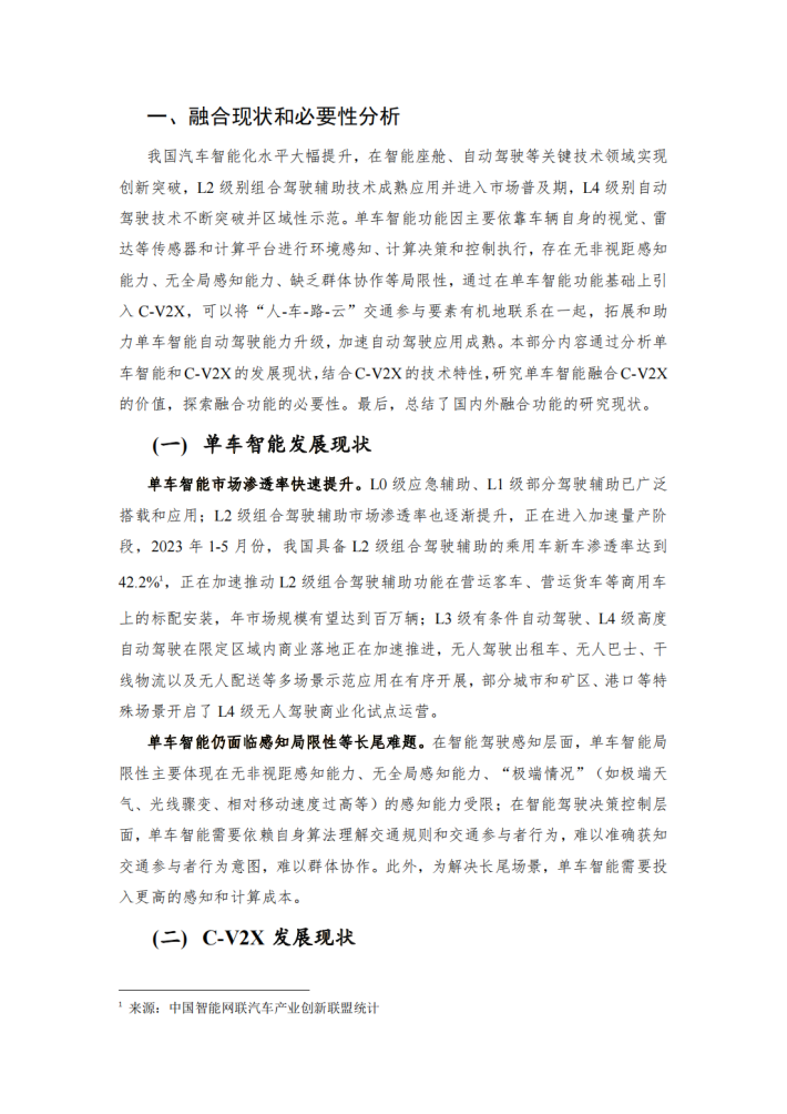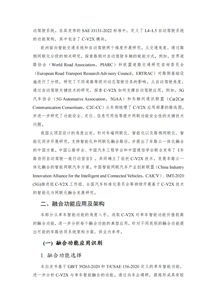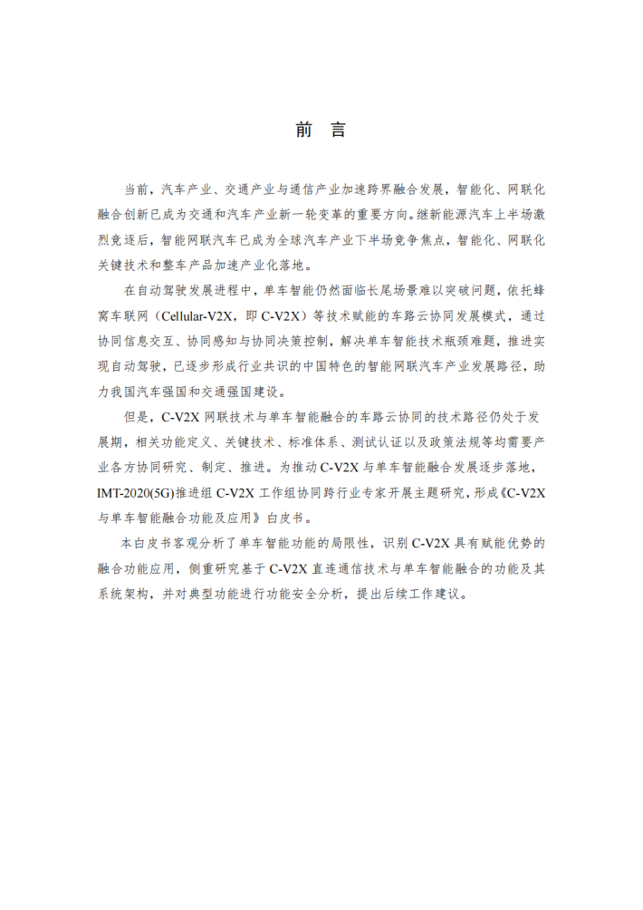 本白皮书客观分析了单车智能功能的局限性,识别C-V2X具有赋能优势的融合功能应用,侧重研究基于C-V2X直连通信技术与单车智能融合的功能及其系统架构,并对典型功能进行功能安全分析,提出后续工作建议。
