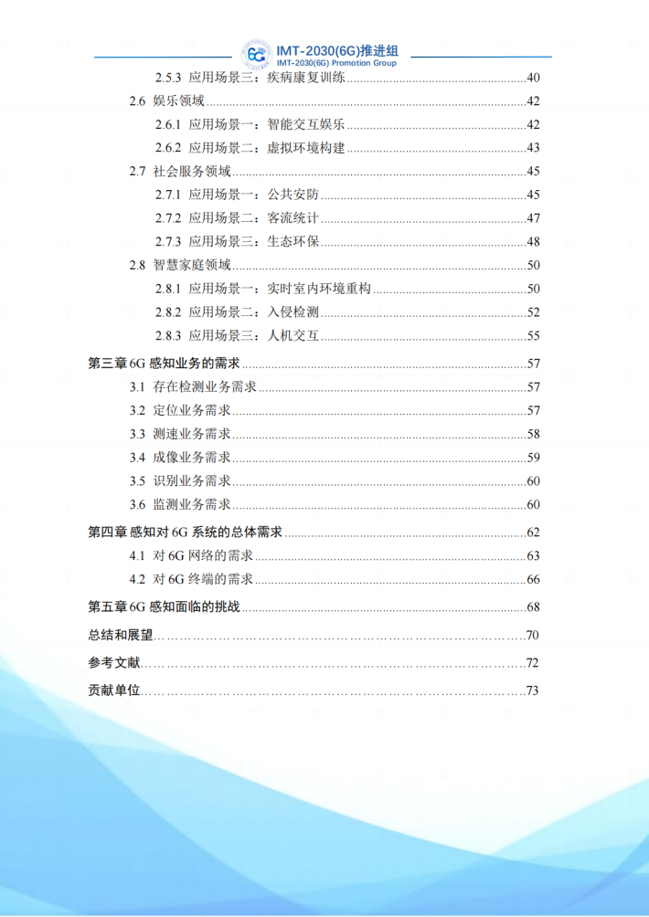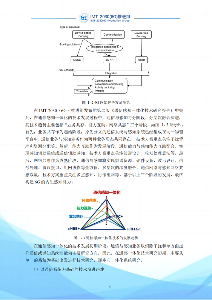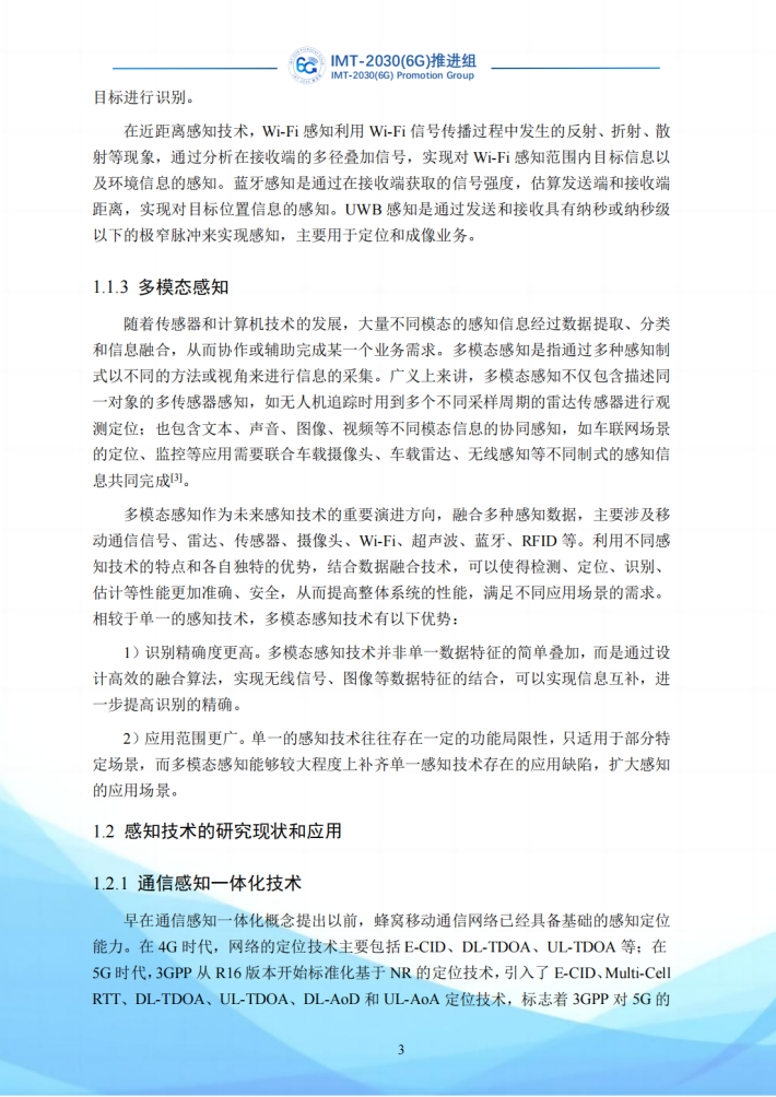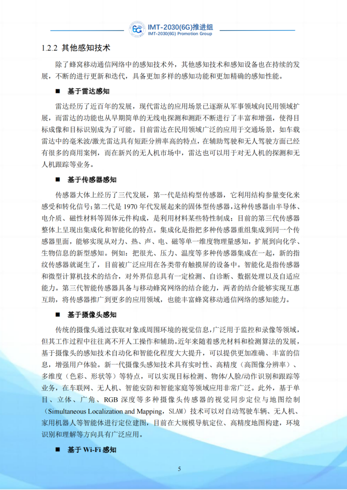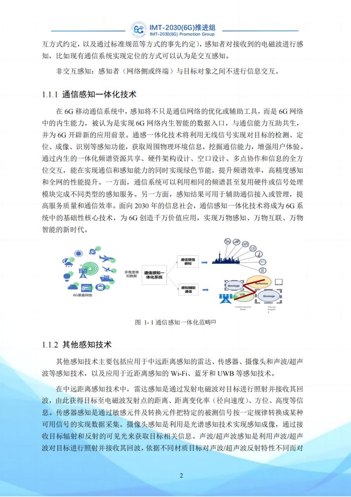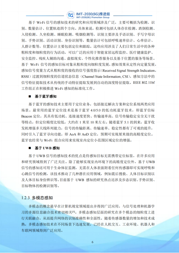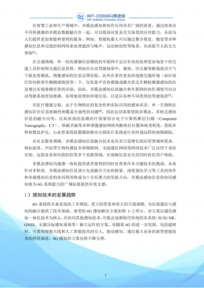 感知是人类与物理世界交互不可或缺的重要组成部分。一方面,随着物联网技术、计算机技术、信息通信技术的发展,机器逐渐被赋予智能化的感知能力。基于雷达、传感器、摄像头、Wi-Fi、蓝牙、超声波等设备的感知技术目前已在工业、农业、娱乐、”医疗、教育等领域发挥重要作用。这些感知技术在特定应用场景具有各自的优势,但也存在一定的不足。另一方面,随着移动通信技术的发展,无线系统会向更高频率(如毫米波、太赫兹等)演进,且有大量可用频谱,通信系统将具备与感知系统相似的能力,利用广泛覆盖的移动通信信号实现通信感知一体化,成为有效地节约成本,促进通信与感知的互利互惠有效途径。在未来6G时代,通信感知一体化技术将依托太赫兹、甚至可见光等新频段,以及空天地一体化、内生AI等新技术,赋予6G系统内生的感知能力。此外,以通信感知一体化技术为核心,且集成上述其他感知技术的多模态感知将极大的增强6G系统的感知能力,扩展6G感知的业务范围,提升6G感知的性能,助力不同领域感知技术发展。