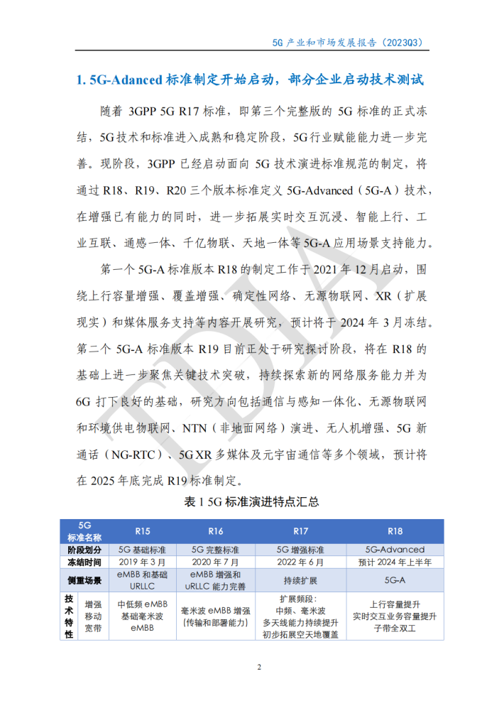 第一个5G-A标准版本R18的制定工作于2021年12月启动,围绕上行容量增强、覆盖增强、确定性网络、无源物联网、XR(扩展现实)和媒体服务支持等内容开展研究,预计将于2024年3月冻结。