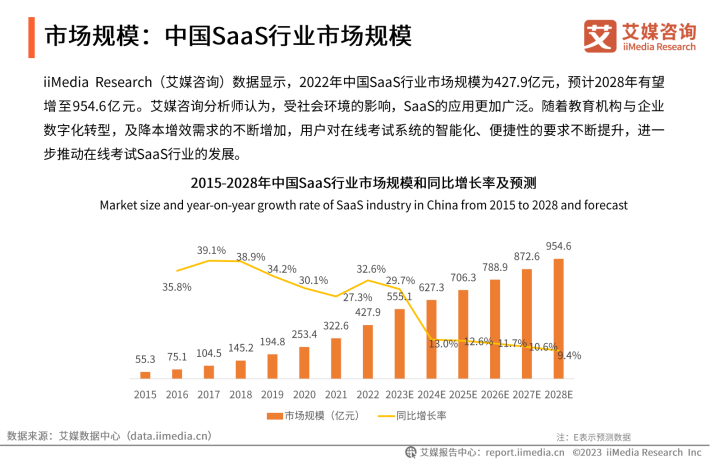 iiMedia Research(艾媒咨询)数据显示,2022年中国SaaS行业市场规模为427.9亿元,2028年有望增至954.6亿元。随着教育机构与企业数字化转型、降本增效需求的不断增加,用户对在线考试系统的智能化、便捷性的要求也不断提升,预计未来SaaS行业市场规模将持续增长。