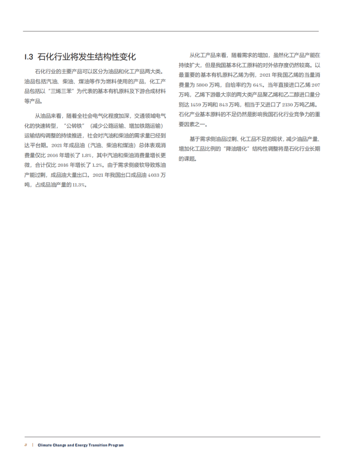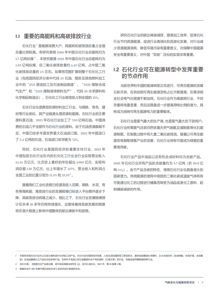 石化行业是重要的高能耗和高碳排放行业,也是国民经济不可或缺的重要行业。2021年中国仅石油基石化产品的碳排放就占全社会碳排放的4%左右。石化行业产品涉及燃料和材料两大领域,为社会提供从燃油、 “三烯三苯”到合成树脂、合成纤维、合成橡胶等各种能源及化工产品。中国石化产品的人均消费仍然显著低于发达国家,石化行业还有较大增长空间,这意味着其低碳发展的程度将在很大程度上影响中国整体的碳达峰碳中和进程。研究石化行业的碳达峰碳减排,提高加工效率,促使石化行业节约资源能源,促进行业高端化和低碳化发展,对行业减少资源能源消耗,降低环境污染有重要意义,对保障中国能源安全有重要意义,对中国“双碳”目标的实现非常重要。