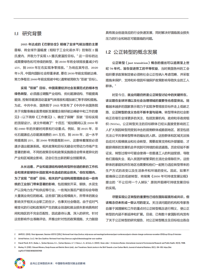 为推动全球贯彻落实《巴黎协定》,支持中国在2030年前实现碳达峰和在2060年前实现碳中和的双重气候目标,中国需要转变经济结构、能源结构、生产和生活方式。“绿色转型”不仅对于保护我们赖以生存的环境至关重要,同时也会带来新的机遇,根据预测绿色转型会为中国的能源行业额外创造360万个就业岗位。然而,转型所需的产业改革也可能对某些部门、地区和群体产生不成比例的影响,同时并非所有部门、地区和群体都能平等地获得新创造的绿色就业机会。因此,为确保实现一个惠及所有人的公正转型,需要减少潜在的社会经济负面影响和风险。