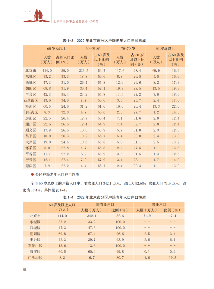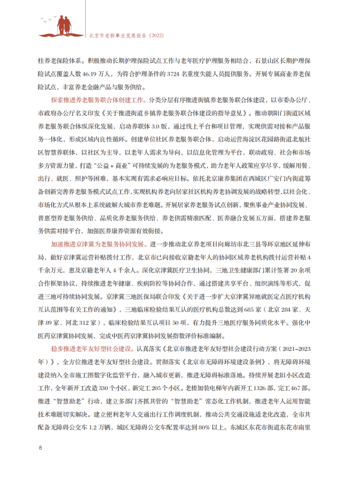 健全基本养老服务体系。织密居家社区养老服务网络,全年发展建设养老助餐点153家,全市累计建成1489家,缓解居家老年人用餐难题。全市累计建成运营社区养老服务驿站1429个、养老照料中心293个;2022年新建养老家庭照护床位3682张,累计建成9千余张。推进机构养老服务建设,全市已建成运营养老机构578家,床位11.2万张。印发《北京市社区养老服务驿站服务质量星级评定管理办法(试行)》《北京市养老机构服务质量星级评定管理办法(试行)》,共评定星级社区养老服务驿站814家、星级养老机构458家。修订出台《北京市老年人能力评估实施办法(试行)》,取消失能老年人护理补贴消费限制,目前,失能老年人护理补贴可在全市1.1万余家养老助残服务商任意消费使用。