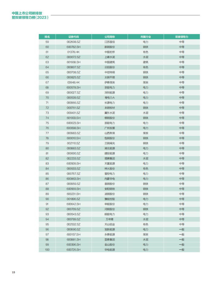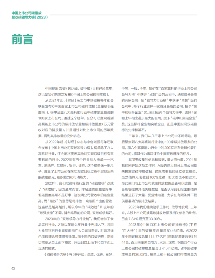 从2021年起,《财经》杂志与中创碳投每年都会联合发布《中国百家上市公司碳排放榜(总量榜&强度榜)》,榜单涵盖八大高耗能行业中碳排放量最高的100家上市公司。通过这个榜单,公众可以直观看到高耗能上市公司的碳排放总量和碳排放强度(万元营收对应的排放量)。并且通过对比上市公司的历年数据,看到其排放量的变化轨迹。
