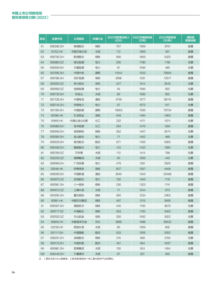 2023年,我们把高耗能行业的“碳强度榜”改成了“碳效榜”。因为通常而言,排名越靠前越是好事,但碳强度高可不是好事,这说明公司营收中的碳含量高。而“碳效”的意思是每排放一吨碳所产出的营收,这当然是越高越好。所以今年的“碳效榜”和去年的“碳强度榜”不同,排名越靠前的公司,双碳成绩越好。