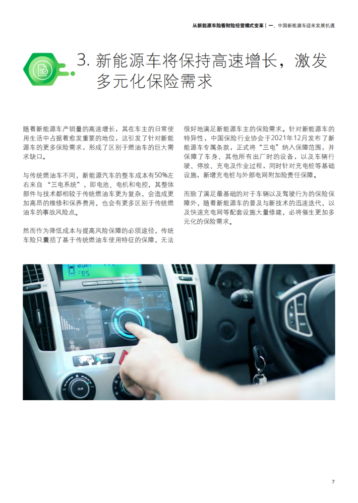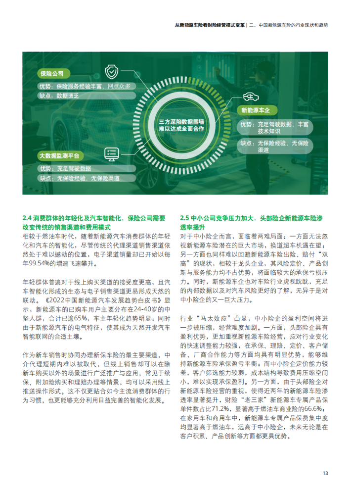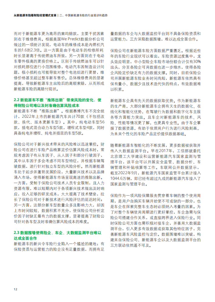 新能源汽车的蓬勃发展给保险市场带来了更多发展机遇,同时也使传统的财险行业面临新能源车险开拓及经营发展难题。一方面,面对不断推陈出新的新能源车型的风险把控难以保证;另一方面,财险行业本身传统的销售渠道、产品开发定价、核保理赔、风险管理已难以满足发展新能源车险的要求。在多方驱动下,汽车行业逐渐布局保险行业并转向包含生产、销售、金融产品、出行服务等一系列环节车生态的建设方向,给财险行业的传统经营模式带来巨大挑战。由此,财险行业应结合用户实际需求探索更多保险创新产品保障,并积极联动生态链中多方角色、推动产业融合,提供更为优质且贯穿车辆使用始终的保障服务,以此应对新能源汽车带来的车险经营变革。