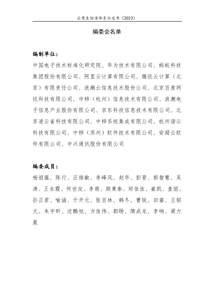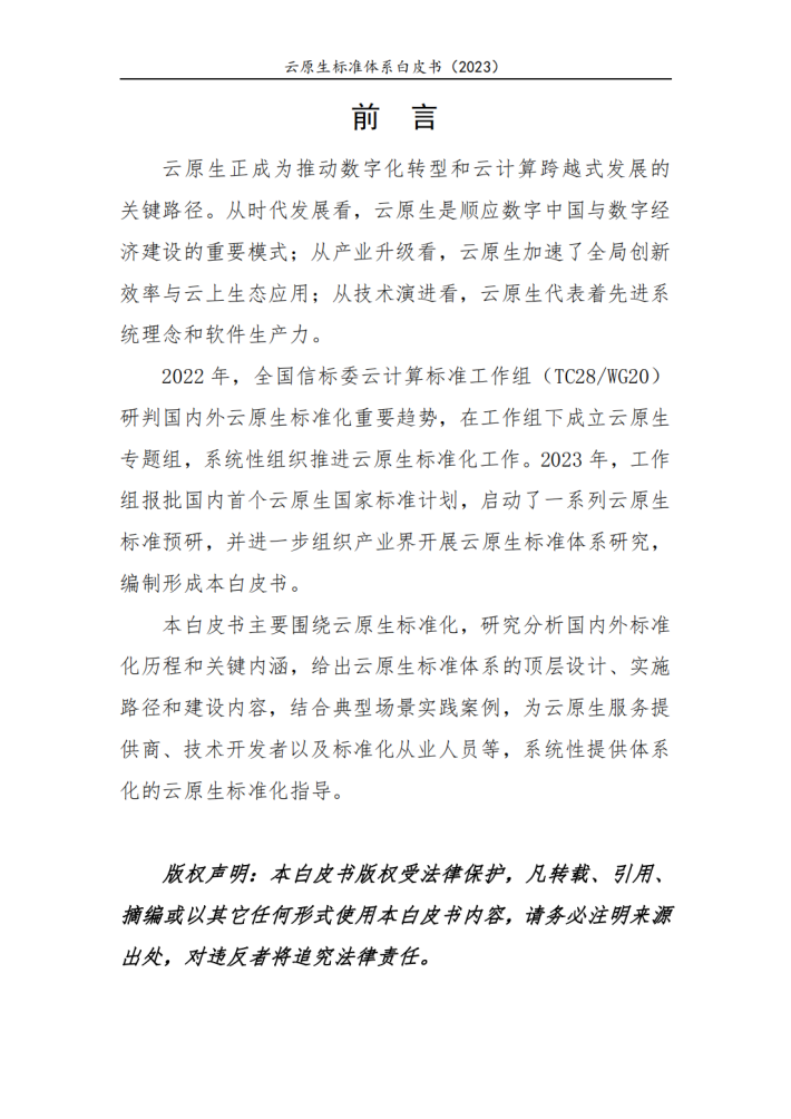 2022年,全国信标委云计算标准工作组(TC28/WG20)研判国内外云原生标准化重要趋势,在工作组下成立云原生专题组,系统性组织推进云原生标准化工作。2023年,工作组报批国内首个云原生国家标准计划,启动了一系列云原生标准预研,并进一步组织产业界开展云原生标准体系研究,编制形成本白皮书。